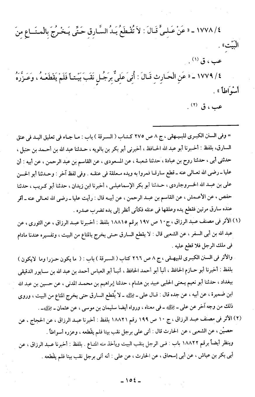 4/ 1779 - "عَنِ الحَارِثِ قَالَ: أُتِىَ عَلِىٌّ بِرَجُلٍ نَقَبَ بَيْتًا فَلَمْ يَقْطَعْهُ، وَعَزَّرَهُ أَسْوَاطًا".