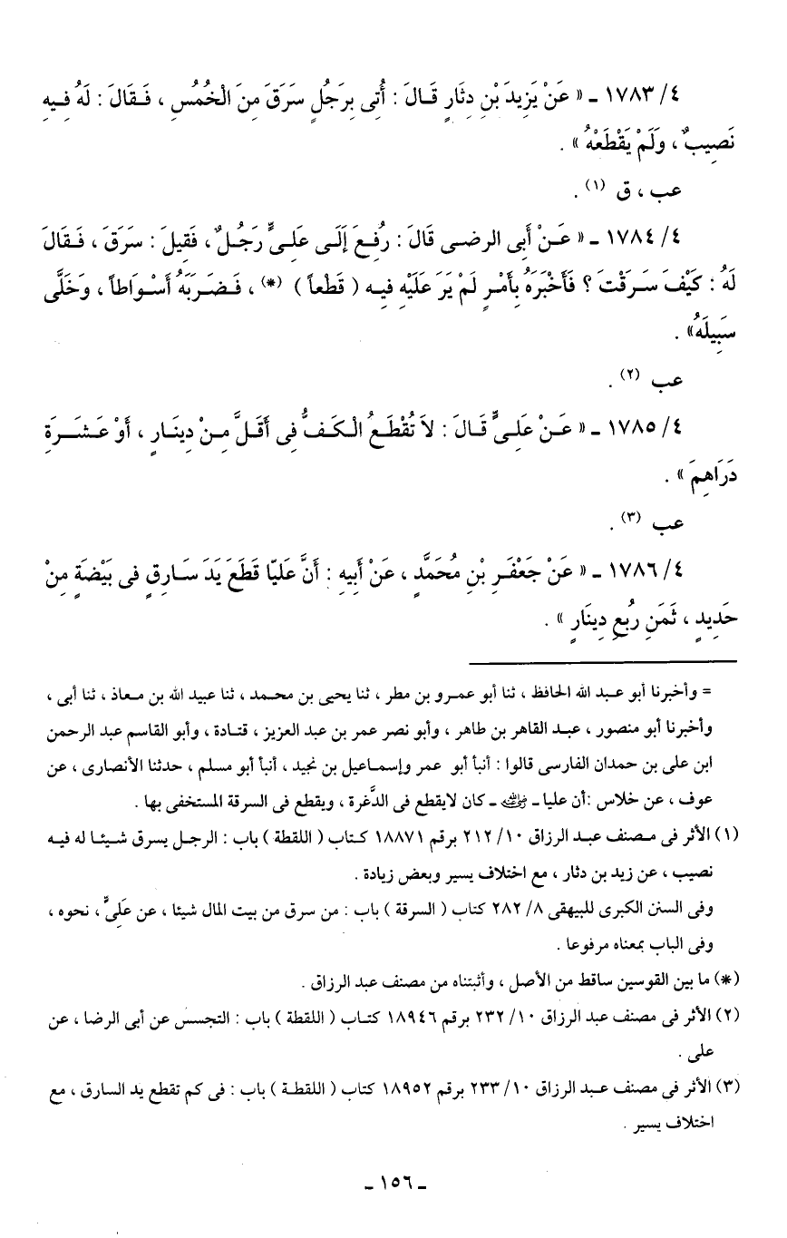 4/ 1784 - "عَنْ أَبِى الرضى قَالَ: رُفِعَ إَلَى عَلِىٍّ رَجُلٌ، فَقِيلَ: سَرَقَ، فَقَالَ لَهُ: كَيْفَ سَرَقْتَ؟ فَأَخْبَرَهُ بِأَمْرٍ لَمْ يَرَ عَلَيْهِ فِيه (قَطْعًا) (*)، فَضَرَبَهُ أَسْوَاطًا، وَخَلَّى سَبِيلَهُ".