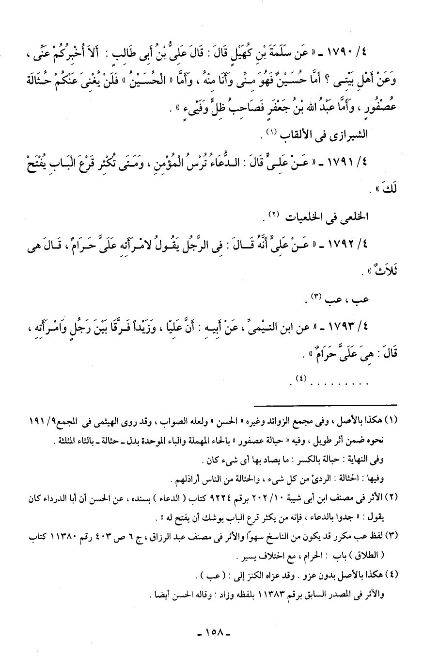 4/ 1793 - "عن ابن التيْمىِّ، عَنْ أَبِيهِ: أَنَّ عَلِيّا، وَزَيْدًا فَرَّقَا بَيْنَ رَجُلٍ وَامْرَأَتِهِ، قَالَ: هِىَ عَلَىَّ حَرَامٌ".