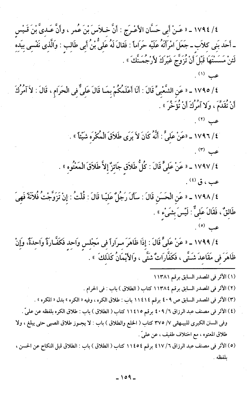 4/ 1794 - "عَنْ أَبِى حَسَّان الأَعْرَج: أَنَّ خِلَاسَ بْنَ عُمر، وأَنَّ عَدِىَّ بْنَ قَيْسٍ - أَحَد بَنِى كِلَابٍ - جَعَلَ امْرَأَتَهُ عَلَيْه حَرَامًا: فَقالَ لَهُ عَلِىُّ بْنُ أَبِى طَالِبٍ: وَالَّذِى نَفْسِى بِيَدِهِ لَئنْ مَسَسْتَهَا قَبْلَ أَنْ تُزَوَّجَ غَيْرَكَ لأَرْجُمَنَّكَ".