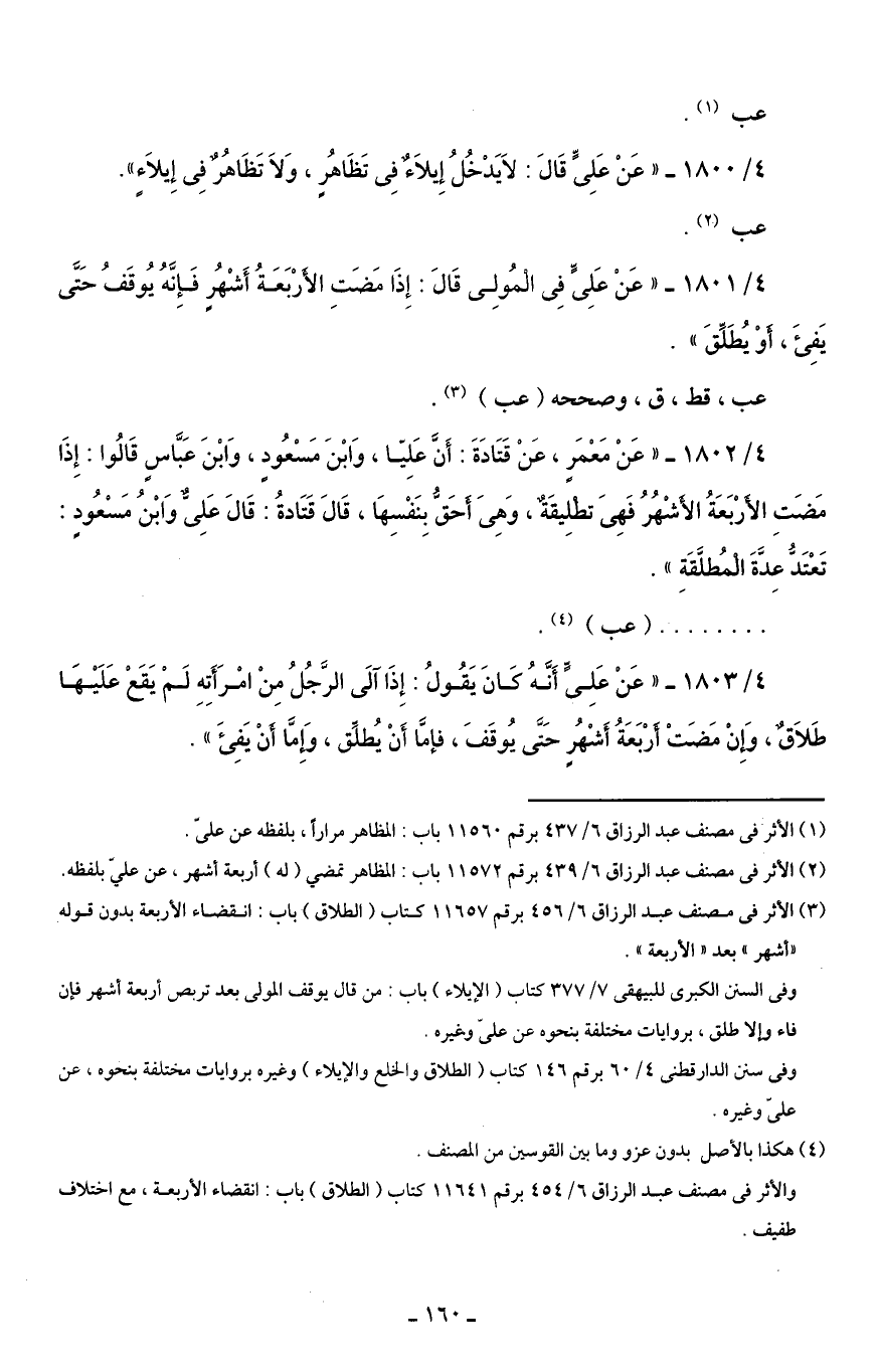 4/ 1803 - "عَنْ عَلِىٍّ أَنَّهُ كَانَ يَقُولُ: إِذَا آلَى الرَّجُلُ مِنْ امْرَأَتِهِ لَمْ يَقَعْ عَلَيْهَا طَلَاقٌ، وَإنْ مَضَتْ أَرْبَعَةُ أَشْهُرٍ حَتَّى يُوقَفَ، فإمَّا أَنْ يُطلِّق، وَإِمَّا أَنْ يَفِئَ".