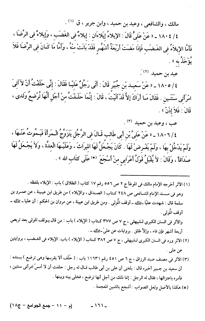 (¬3) الأثر في مصنف عبد الرزاق، ج 6 ص 451 رقم 11631 باب: (حَلَف ألا يقربها وهى ترضع) بسنده: أن سعيد بن جبير أخبره قال: بلغنى أن على بن أبى طالب قال له رجل: حلفت أن لا أمسّ امرأتى سنتين، فأمره باعتزالها، فقال له الرجل: إنما ذلك من أجل أنها ترضع، فخلى بينه وبينها.
