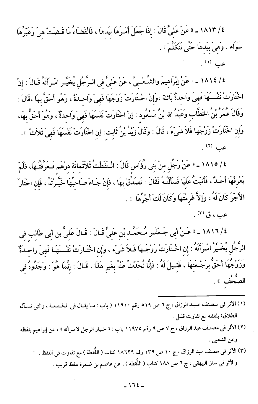 4/ 1814 - "عَنْ إِبْرَاهِيمَ والشَّعْبِىَّ، عَنْ عَلِىٍّ فِى الرَّجُلِ يُخَيَّر امْرَأتَهُ قَالَ: إِنْ اخْتَارَتْ نَفْسَهَا فَهِىَ وَاحِدَةٌ بَائنة، وَإِنْ اخْتَارَتْ زَوْجَهَا فَهِىَ وَاحِدَةٌ، وَهُو أَحَقُّ بِهَا، قَالَ: وَقَالَ عُمَرُ بْنُ الخَطَّابِ وَعَبْدُ الله بْنُ مَسْعُودٍ: إنْ اخْتَارَتْ نَفْسَهَا فَهِىَ وَاحِدَةٌ، وَهُوَ أَحَقُّ بِهَا، وَإِنِ اخْتَارَتْ زَوْجَها فَلَا شَىْءَ، قَالَ: وَقَالَ زَيْدُ بْنُ ثَابِتٍ: إنِ اخْتَارَتْ نَفْسَهَا فَهِىَ ثَلَاثٌ".