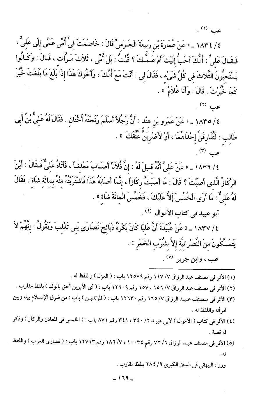 4/ 1837 - "عَنْ عُبَيْدَةَ أَنَّ عَلِيّا كَانَ يَكْرَهُ ذَبَائِحَ نَصَارَى بَنِى تَغْلِبَ وَيَقُولُ: إِنَّهُمْ لَا يَتَمَسَّكُونَ مِنَ النَّصْرانِيَّةِ إِلَّا بِشُرْبِ الْخَمْرِ".
