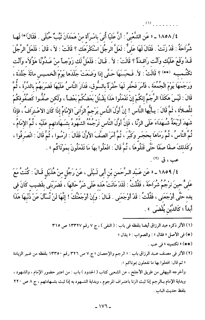 4/ 1858 - "عَن الشَّعْبِىِّ: أَنَّ عَلِيّا أُتِىَ بِامْرَأَةٍ مِنْ هَمَدَانَ ثَيِّبٌ حُبْلَى. فَقَالَ (*) لَها شُرَاحَةُ: قَدْ زَنَتْ. فَقَالَ لَهَا عَلِىٌّ: لَعَلَّ الرجُلَ اسْتَكْرَهَكِ؟ قَالَتْ: لَا، قَالَ: فَلَعَلَّ الرَّجُلَ قَدْ وَقَعَ عَلَيْكِ وَأَنْتِ رَاقِدَةٌ؟ قَالَتْ: لَا. قَالَ: فَلَعَلَّ لَكِ زَوْجًا مِنْ عَدُوَّنَا هَؤُلَاءِ وَأَنْتِ تكْتُمِيِه (* *)؟ قَالَتْ: لَا. فَحَبَسَهَا حَتَّى إِذا وَضَعَتْ جَلَدَها يَوْمَ الْخميسِ مائَةَ جَلْدَة، وَرَجَمَهَا يَوْمَ الْجُمُعَةِ، فَأَمَرَ فَحُفِر لَهَا حُفْرَةٌ بِالسُّوقِ، فَدَارَ النَّاسُ عَلَيْهَا فَضَرَبهُمْ بِالدَّرَّةِ، ثُمَّ قَالَ: لَيْسَ هَكَذَا الرَّجْمُ إِنكُمْ إِنْ تَفْعَلُوا هَذَا يَقْتُلْ بَعْضُكُمْ بَعْضًا، وَلَكِن صُفُّوا كَصُفُوفِكُمْ لِلَّصلَاةِ، ثَمَّ قَالَ: يأَيُّها النَّاس! إِنَّ أَوَّلَ النَّاسِ يَرْجِمُ الزَّانِىَ الإِمْامُ إِذَا كَان الاعْتِرَافُ، فإِذَا شَهِدَ أَرْبَعَةُ شُهَدَاءَ عَلَى الزِّنَا، فَإِنَّ أَوَّلَ النَّاسِ تَرْجُمُهُ الشَّهُودُ بِشَهَادتهِمِ عَلَيْهِ، ثُمَّ الإِمَامُ، ثُمَّ النَّاسُ، ثُمَّ رَمَاهَا بحَجَرٍ وَكَبَّرَ، ثُمَّ أَمَرَ الصَّفَ الأَوَّلَ فَقَالَ: ارْمُوا، ثُمَّ قَالَ: انْصَرِفُوا، وَكَذلِكَ صفّا صَفّا حَتَّى قَتَلُوهَا، ثُمَّ قَالَ: افْعَلُوا بهَا مَا تَفْعَلُونَ بِمَوْتَاكُم".