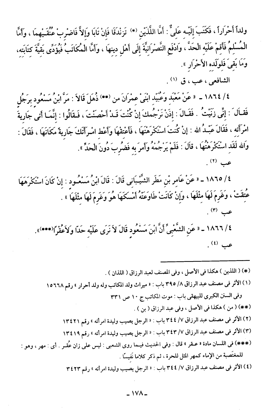 4/ 1866 - "عَنِ الشَّعْبِىِّ أَنَّ ابْنَ مَسْعُودٍ قَالَ لَا نَرَى عَلَيْهِ حَدّا وَلَا عُقْرًا (* * *).