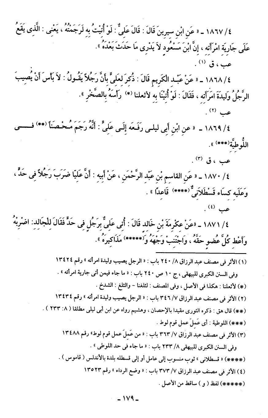 4/ 1869 - "عنِ ابْنِ أَبِى ليلى رَفَعَه إِلَى عَلِىٍّ: أَنَّهُ رَجَمَ مُحْصَنًا (* *) في اللُّوطِيَّةِ (* * *) ".
