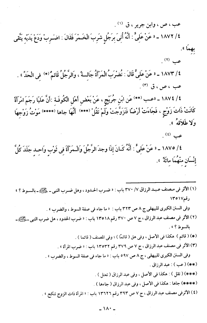 4/ 1873 - "عَنْ عَلِىٍّ قَالَ: تُضْرَبُ الْمَرْأَةُ جَالِسةً، وَالرَّجُلُ قَائمٌ (*) فِى الحَدِّ".