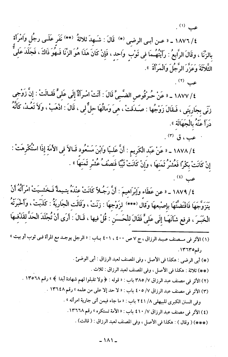 4/ 1876 - "عن أبى الرضِى (*) قَالَ: شَهِدَ ثلاثةُ (* *) نَفَرٍ عَلَى رجُلٍ وَامْرَأةٍ بِالزِّنَا، وقَالَ الرَّابعُ: رَأَيْتُهُمَا فِى ثَوْبٍ وَاحِدٍ، فَإِنْ كَانَ هَذَا هُوَ الزِّنَا فَهُوَ ذَاكَ، فَجَلَدَ عَلِىٌّ الثَّلَاثَةَ وَعَزَّرَ الرَّجُلَ وَالْمَرْأَةَ".