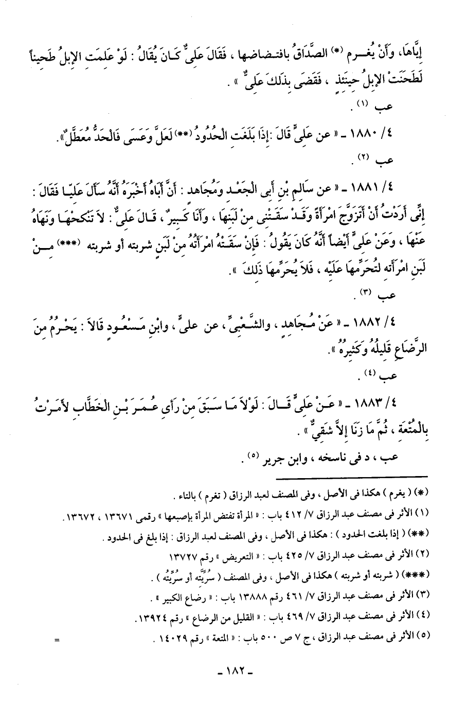 4/ 1881 - "عن سَالِمِ بْنِ أَبِى الْجَعْدِ وَمُجَاهدٍ: أَنَّ أَبَاهُ أَخْبَرَهُ أنَّهُ سَأَلَ عَلِيّا فَقَالَ: إِنِّى أَرَدْتُ أَنْ أَتَزَوَّجَ امْرَأَةً وَقَدْ سَقَتْنِى مِنْ لَبَنِهَا، وَأَنَا كبِيرٌ، قَالَ عَلِىٌّ: لَا تَنْكحْهَا وَنَهَاهُ عَنْهَا، وَعَنْ عَلِىٍّ أَيْضًا أنَّهُ كَانَ يَقُولُ: فَإِنْ سَقَتْهُ امْرَأَتُهُ مِنْ لَبَنٍ شربته أو شربته (* * *) مِنْ لَبَنِ امْرَأَتهِ لتُحَرَّمهَا عَلَيْهِ، فَلَا يُحَرِّمهَا ذَلِكَ".