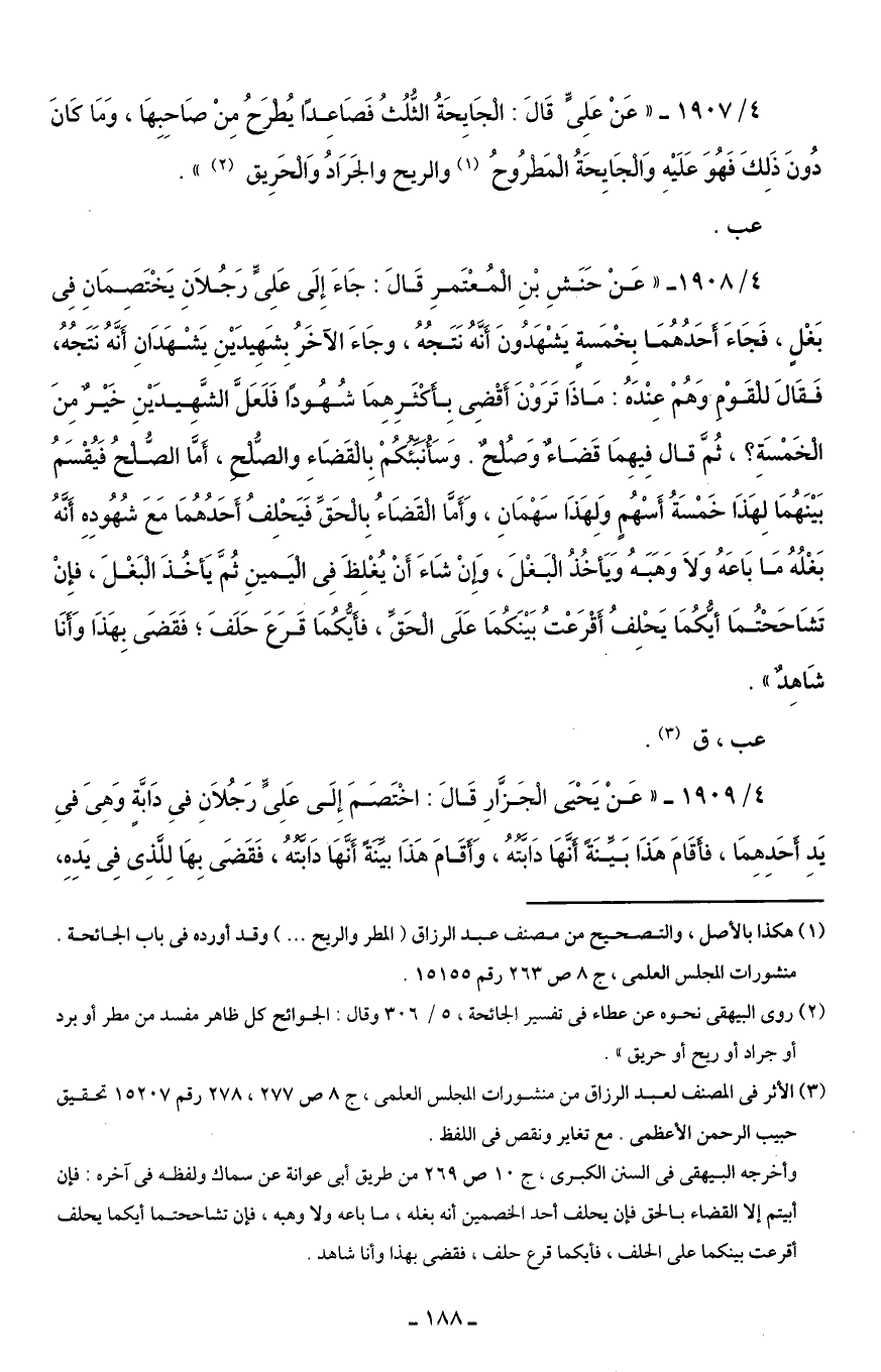 4/ 1908 - "عَنْ حَنَشِ بْنِ الْمُعْتَمرِ قَالَ: جَاءَ إِلَى عَلِىٍّ رَجُلَانِ يَخْتَصِمَانِ فِى بَغْلٍ، فَجَاءَ أَحَدُهُمَا بِخْمَسةٍ يَشْهَدُونَ أَنَّهُ نَتَجُهُ، وجَاءَ الآخَرُ بِشَهِيدَيْنِ يَشْهَدَانِ أَنَّهُ نَتَجُهُ، فَقَالَ للْقَوْمِ وَهُمْ عِنْدَهُ: مَاذَا تَرَوْنَ أَقْضِى بِأَكْثَرِهِمَا شُهُودًا فَلَعَلَّ الشَّهِيدَيْنِ خَيْرٌ مِنَ الْخَمْسَةِ؟ ، ثُمَّ قال فِيهِمَا قَضَاءٌ وَصُلْحٌ. وَسَأُنَبَّئُكُمْ بِالْقَضَاءِ والصُّلْحِ، أَمَّا الصُّلْحُ فَيُقْسَمُ بَيْنَهُمَا لِهَذَا خَمْسَةُ أَسْهُمٍ وَلِهَذَا سَهْمَانِ، وَأَمَّا القَضَاءُ بِالْحَقِّ فَيَحْلِفُ أَحَدُهُمَا مَعَ شُهُودِهِ أَنَّهُ بَغْلُهُ مَا بَاعَهُ وَلَا وَهَبَهُ وَيَأخُذُ الْبَغْلَ، وَإِنْ شَاءَ أَنْ يُغْلِظَ فِى الْيَمينِ ثُمَّ يَأخُذَ البَغْلَ، فإِنْ تَشَاحَحْتُمَا أيُّكُمَا يَحْلِفُ أَقْرَعْتُ بَيْنَكُمَا عَلَى الْحَقِّ، فأَيُّكُمَا قَرعَ حَلَفَ؛ فَقَضَى بِهَذَا وَأَنَا شَاهِدٌ".