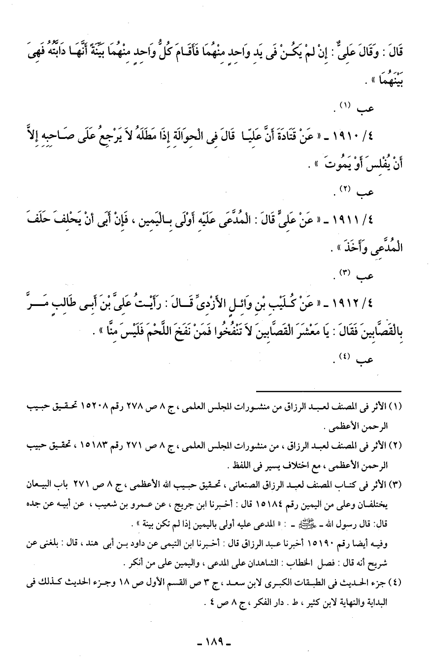 4/ 1911 - "عَنْ عَلِىٍّ قَالَ: المُدَّعَى عَلَيْهِ أَوْلَى بِالْيَمِين، فَإِنْ أَبَى أنْ يَحْلِفَ حَلَفَ المُدَّعِى وَأَخَذَ".