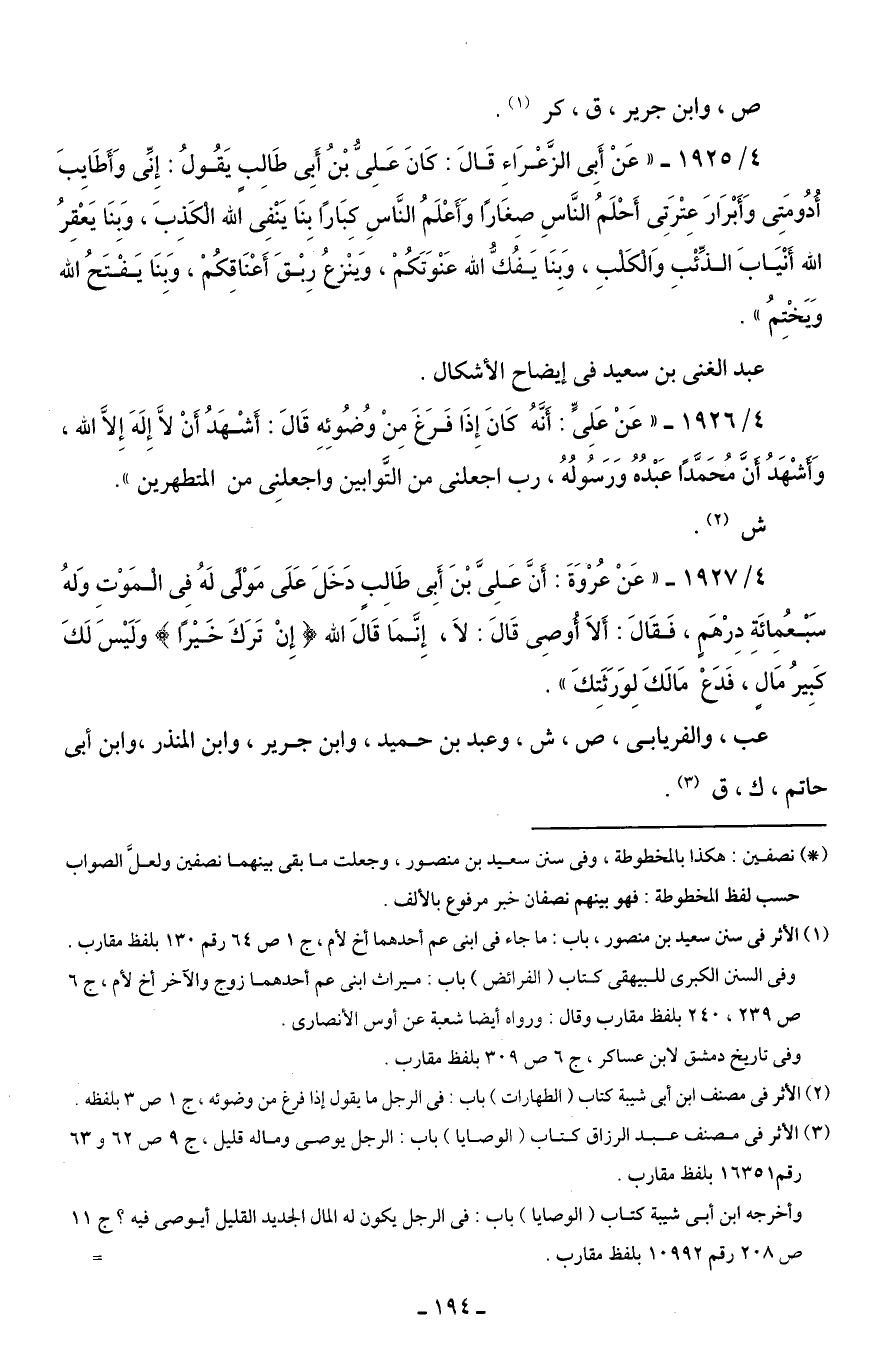 4/ 1927 - "عَنْ عُرْوَةَ: أَنَّ عَلِىَّ بْنَ أَبِى طَالِبٍ دَخَلَ عَلَى مَوْلًى لَهُ فِى الْمَوْتِ وَلهُ سَبْعُمِائَةِ دِرْهَمٍ، فَقَالَ: أَلَا أُوصِى قَالَ: لَا، إِنَّمَا قَالَ الله {إِنْ تَرَكَ خَيْرًا} وَلَيْسَ لَكَ كَبِيرُ مَالٍ، فَدَعْ مَالَكَ لِوَرَثَتِكَ".