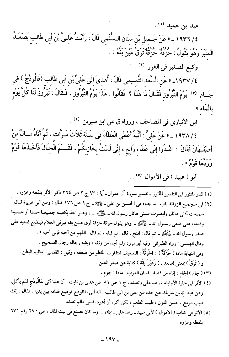 4/ 1937 - "عَنِ الْسَّعدِ التَّمِيمِى قَالَ: أُهْدِىَ إِلَى عَلِىِّ بْنِ أَبِى طَالِبٍ (فَالُوذْجْ) فِى جَامِ (¬3) يَوْمَ النَّيْرُوزِ فَقَالَ مَا هَذَا؟ فَقَالُوا: هَذَا يَوْمُ النَّيْرُوزِ، فَقَالَ: نَيْرُوزَ لَنَا كُلَّ يَوْمٍ بِالْمَاءِ".