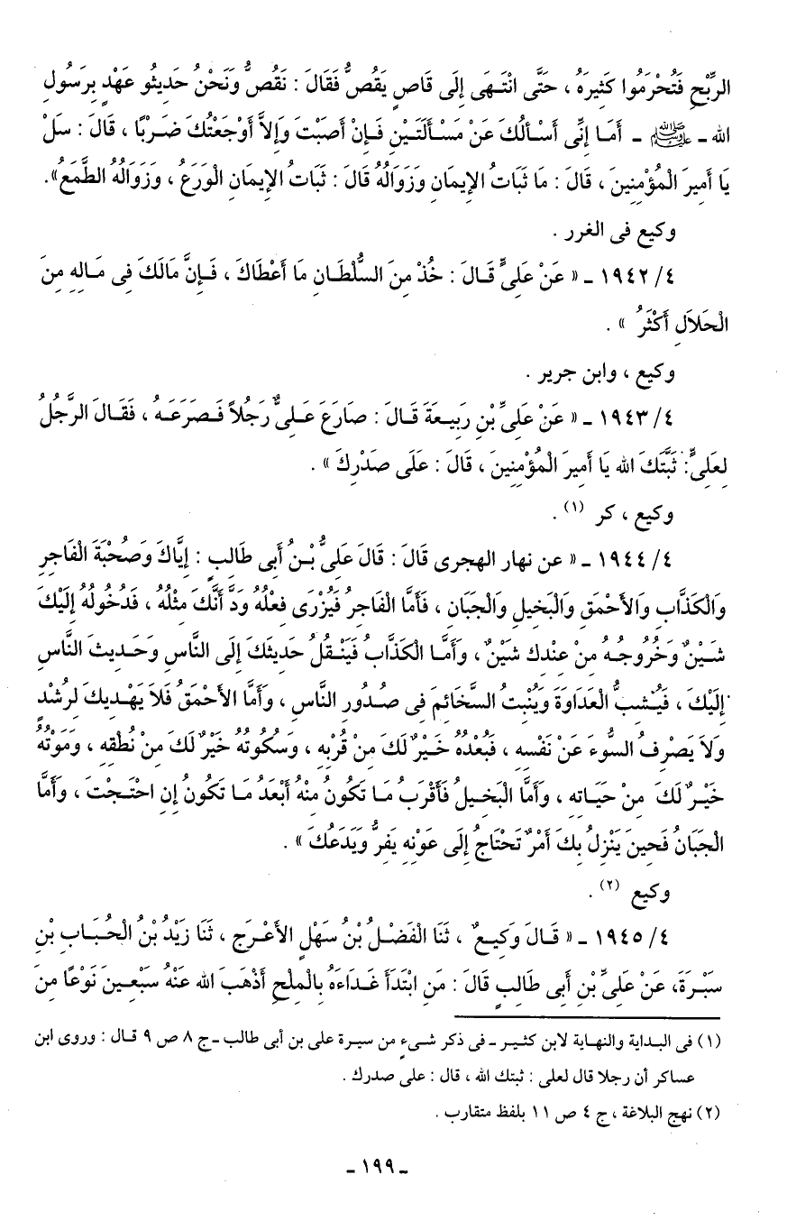 4/ 1944 - "عن نهار الهجرى قَالَ: قَالَ عَلِىُّ بْنُ أَبِى طَالِبٍ: إِيَّاكَ وَصُحْبَةَ الْفَاجِرِ وَالْكَذَّابِ وَالأَحْمَقِ وَالْبَخِيلِ وَالْجَبَانِ، فَأمَّا الْفَاجِرُ فَيُزْرَى فِعْلُهُ وَدَّ أَنَّكَ مِثْلُهُ، فَدُخُولُهُ إِلَيْكَ شَيْنٌ وَخُرُوجُهُ مِنْ عِنْدِك شَيْنٌ، وَأَمَّا الْكَذَّابُ فَيَنْقُلُ حَدِيثَكَ إِلَى النَّاسِ وَحَدِيثَ النَّاسِ إِلَيْكَ، فَيُشِبُّ الْعَدَاوَةَ وَيُنْبِتُ السَّخَائِمَ فِى صُدُورِ النَّاسِ، وَأَمَّا الأَحْمَقُ فَلَا يَهْديكَ لِرُشْدٍ وَلَا يَصْرِفُ السُّوءَ عَنْ نَفْسِهِ، فَبُعْدُهُ خَيْرٌ لَكَ مِنْ قُرْبِهِ، وَسُكُوتُهُ خَيْرٌ لَكَ مِنْ نُطْقِهِ، وَمَوْتُهُ خَيْرٌ لَكَ مِنْ حَيَاتِهِ، وَأَمَّا الْبَخِيلُ فَأَقْرَبُ مَا تَكُونُ مِنْهُ أبْعَدُ مَا تَكُونُ إِنِ احْتَجْتَ، وَأَمَّا الْجَبَانُ فَحِينَ يَنْزِلُ بِكَ أَمْرٌ تَحْتَاجُ إِلَى عَوْنِهِ يَفِرُّ وَيَدَعُكَ".