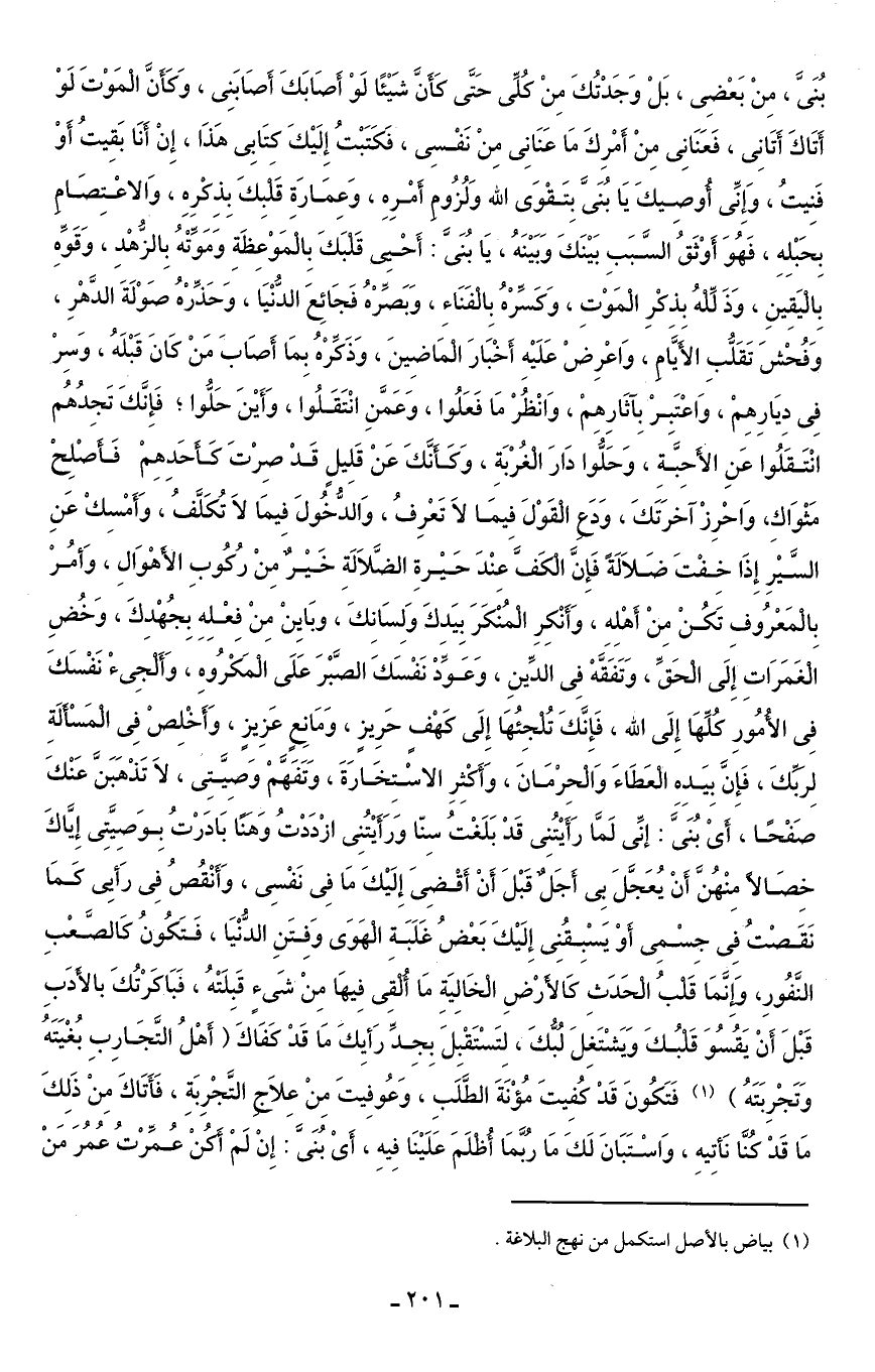 بُنَىَّ، مِنْ بَعْضِى، بَلْ وَجَدْتُكَ مِنْ كُلِّى حَتَّى كَأَنَّ شَيْئًا لَوْ أَصَابَكَ أَصَابَنِى، وَكَأَنَّ الْمَوْتَ لَوْ أَتَاكَ أَتَانِى، فَعَنَانِى مِنْ أَمْرِكَ مَا عَنَانِى مِنْ نَفْسِى، فَكَتَبْتُ إِلَيْكَ كِتَابِى هَذَا، إِنْ أَنَا بَقِيتُ أَوْ فَنِيتُ، وَإِنِّى أُوصِيكَ يَا بُنَىَّ بِتَقْوَى الله وَلُزُومِ أَمْرِهِ، وَعِمَارَة قَلْبِكَ بِذِكْرِهِ، وَالاعْتِصَامِ بِحَبْلِه، فَهُوَ أَوْثَقُ السَّبَبِ بَيْنَكَ وَبَيْنَهُ، يَا بُنَىَّ: أَحْيِى قَلْبَكَ بِالْمَوْعِظَةِ وَمَوِّتْهُ بِالزُّهْدِ، وَقَوِّهِ بِالْيَقِينِ، وَذَلِّلْهُ بِذِكْرِ الْمَوْتِ، وَكسِّرْهُ بِالْفَنَاءِ، وَبَصِّرْهُ فَجَائِعَ الدُّنْيَا، وَحَذِّرْهُ صَوْلَةَ الدَّهْرِ، وَفُحْشَ تَقَلُّبِ الأيَّامِ، وَاعْرِضْ عَلَيْهِ أَخْبَارَ الْمَاضِينَ، وَذَكِّرْهُ بِمَا أَصَابَ مَنْ كَانَ قَبْلَهُ، وَسِرْ فِى دِيَارِهِمْ، وَاعْتَبرْ بِآثَارِهمْ، وَانْظُرْ مَا فَعَلُوا، وَعَمَّنِ انْتَقَلُوا، وَأَيْنَ حَلُّوا؛ فَإِنَّكَ تَجِدُهُم انْتَقَلُوا عَنِ الأَحِبَّةِ، وَحَلُّوَا دَارَ الْغُرْبَةِ، وَكَأَنَّكَ عَنْ قَلِيلٍ قَدْ صِرْتَ كأَحَدِهِمْ فَأَصْلِحْ مَثْوَاكِ، وَاحْرِزْ آخرَتَكَ، وَدَعِ الْقَوْلَ فيمَا لَا تَعْرِفُ، وَالدُّخُولَ فِيمَا لَا تُكَلَّفُ، وَأَمْسِكْ عَنِ السَّيْرِ إِذَا خِفْتَ ضَلَالَةً فَإِنَّ الْكَفَّ عِنْدَ حَيْرةِ الضَّلَالَةِ خَيْرٌ مِنْ رُكُوبِ الأَهْوَالِ، وَأمُرْ بِالْمَعْرُوفِ تَكُنْ مِنْ أَهْلِهِ، وَأَنْكِرِ الْمُنْكَرَ بِيَدِكَ وَلِسَانِكَ، وبَايِنْ مِنْ فعْلِهِ بِجُهْدِكَ، وَخُضِ الْغَمَرَاتِ إِلَى الْحَقِّ، وَتَفَقَّهْ فِى الدِّينِ، وَعَوِّدْ نَفْسَكَ الصَّبْرَ عَلَى الْمَكْرُوهِ، وَأَلْجِئْ نَفْسَكَ فِى الأُمُورِ كُلِّهَا إِلَى الله، فَإنَّكَ تُلْجِئُهَا إِلَى كهْفٍ حَرِيزٍ، وَمَانِعٍ عَزِيزٍ، وَأَخْلِصْ فِى الْمَسْأَلَةِ لِرَبِّكَ، فَإِنَّ بِيَدِه الْعَطَاءَ وَاَلْحِرْمَانَ، وَأَكْثِرِ الاسْتِخَارَةَ، وَتَفَهَّمْ وَصِيَّتِى، لَا تَذْهَبَنَّ عَنْكَ صَفْحًا، أَىْ بُنَىَّ: إنِّى لَمَّا رَأَيْتُنِى قَدْ بَلَغْتُ سِنّا وَرَأَيْتُنِى ازْدَدْتُ وَهنًا بَادَرْتُ بِوَصِيَّتِى إِيَّاكَ خِصَالًا مِنْهُنَّ أَنْ يُعَجَّلَ بِى أَجَلٌ قَبْلَ أَنْ أَقْضِىَ إِلَيْكَ مَا فِى نَفْسِى، وَأَنْقُصُ فِى رَأيى كَمَا نَقَصْت فِى جسْمِى أَوْ يَسْبِقُنِى إِلَيْكَ بَعْضُ غَلَبَةِ الْهَوَى وَفِتَنِ الدُّنْيَا، فَتَكُونُ كَالصَّعْبِ النَّفُورِ، وَإِنَّمَا قَلْبُ الْحَدَثِ كَالأَرْضِ الْخَالِيَةِ مَا أُلْقِى فِيهَا مِنْ شَئٍ قَبِلَتْهُ، فَبَاكَرْتُكَ بالأَدَبِ قَبْلَ أَنْ يَقُسُوَ قَلْبُكَ وَيَشْتَغِلَ لُبُّكَ، لِتَسْتَقْبِلَ بِجِدِّ رَأيِكَ مَا قَدْ كَفَاكَ (أَهْلُ التَّجَارِبِ بُغْيَتَهُ وَتَجْرِبَتَهُ) (¬1) فَتَكُونَ قَدْ كُفِيتَ مُؤْنَةَ الطَّلَبِ، وَعُوفِيتَ مِنْ عِلَاجِ التَّجْرِبَةِ، فَأَتَاكَ مِنْ ذَلِكَ مَا قَدْ كُنَّا نَأتِيهِ، وَاسْتَبَانَ لَكَ مَا رُبَّمَا أُظلَمَ عَلَيْنَا فِيهِ، أَىْ بُنَىَّ: إِنْ لَمْ أَكُنْ عُمِّرْتُ عُمُرَ مَنْ