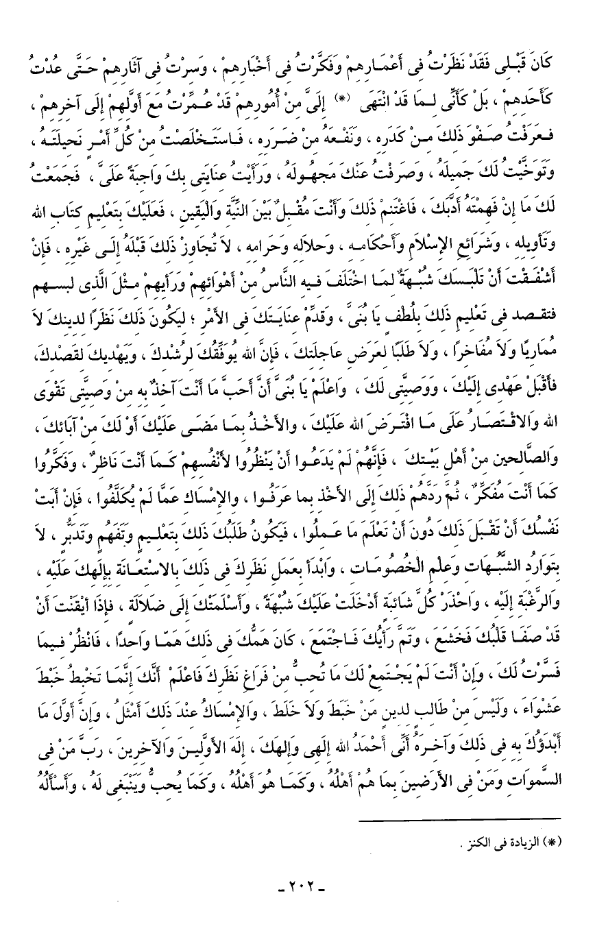 كَانَ قَبْلِى فَقَدْ نَظَرْتُ فِى أَعْمَارِهِمْ وَفَكَّرْتُ فِى أَخْبَارِهِمْ، وَسِرْتُ فِى آثَارِهِمْ حَتَّى عُدْتُ كَأَحَدِهِمْ، بَلْ كَأَنِّى لِمَا قَدْ انْتَهَى (*) إِلَىَّ مِنْ أُمُورِهِمْ قَدْ عُمَّرْتُ مَعَ أَوَّلِهِمْ إِلَى آخِرِهِمْ، فعَرَفْتُ صَفْوَ ذَلِكَ مِنْ كَدَرِهِ، وَنَفْعَهُ مِنْ ضَرَرِهِ، فَاسَتَخْلَصْتُ مِنْ كُلِّ أَمْرٍ نَحِيلَتَهُ، وَتَوَخَّيْتُ لَكَ جَمِيلَهُ، وَصَرفْتُ عَنْكَ مَجهُولَهُ، وَرَأَيْتُ عِنَايَتِى بكَ وَاجِبَةً عَلَىَّ، فَجَمَعْتُ لَكَ مَا إِنْ فَهِمْتَهُ أَدَّبَكَ، فَاغْتَنِمْ ذَلِكَ وَأَنْتَ مُقْبِلٌ بَيْنَ النِّيَّةِ وَالْيَقِينَ، فَعَلَيْكَ بِتَعْلِيمِ كِتَابِ الله وَتَأوِيلِهِ، وَشَرَائِعِ الإِسْلَامِ وَأَحْكَامِهِ، وَحلَالِهِ وَحَرامِهِ، لَا تُجَاوِزْ ذَلِكَ قَبْلَهُ إِلَى غَيْرِهِ، فَإِنْ أَشْفَقْتَ أَنْ تَلْبَسَكً شُبْهَةٌ لمَا اخْتَلَفَ فِيهِ النَّاسُ مِنْ أَهْوَائِهِمْ وَرَأيِهِمْ مِثْلَ الَّذِى لبسهم فتقصد فِى تَعْلِيمِ ذَلِكَ بِلُطْفٍ يَا بُنَىَّ، وَقدِّمْ عِنَايَتَكَ فِى الأَمْرِ؛ لِيَكُونَ ذَلِكَ نَظَرًا لِدِينِكَ لَا مُمَارِيًا وَلَا مُفَاخِرًا، وَلَا طَلبًا لعَرَضِ عَاجِلَتِكَ، فَإِنَّ الله يُوَفِّقُكَ لِرُشْدِكَ، وَيَهْدِيكَ لِقَصْدِكَ، فأَقْبَلْ عَهْدِى إِلَيْكَ، وَوَصِيَّتِى لَكَ، وَاعْلَمْ يَا بُنَىَّ أَنَّ أَحَبَّ مَا أَنْتَ آخِذٌ بِهِ مِنْ وَصِيَّتِى تَقْوَى الله وَالاقْتَصَارُ عَلَى مَا افْتَرَضَ الله عَلَيْكَ، والأَخْذُ بِمَا مَضَى عَلَيْكَ أَوْ لَكَ مِنْ آبَائِكَ، وَالصَّالِحين مِنْ أَهْلِ بَيْتِكَ، فَإِنَّهُمْ لَمْ يَدَعُوا أَنْ يَنْظُرُوا لأَنْفُسِهِمْ عَمَّا أَنْتَ نَاظِرٌ، وَفَكَّرُوا كَمَا أَنْتَ مُفَكِّرٌ، ثُمَّ رَدَّهُمْ ذَلِكَ إِلَى الأَخْذِ بِما عَرَفُوا، وَالإِمْسَاكِ عَمَّا لَمْ يُكَلَّفُوا، فَإِنْ أَبَتْ نَفْسُكَ أَنْ تَقْبَلَ ذَلِكَ دُونَ أَنْ تَعْلَمَ مَا عَمِلُوا، فَيَكُونُ طَلَبُكَ ذَلِكَ بِتَعْلِيمٍ وَتَفَهُمٍ وَتَدَبُّرٍ، لَا بِتَوَارُدِ الشَّبُهَاتِ وَعِلْم الْخُصُومَاتِ، وَابْدَأ بِعَمَلِ نَظَرِكَ فِى ذَلِكَ بِالاسْتِعَانَةِ بِإِلَهِكَ عَلَيْهِ، وَالرَّغْبَةِ إِلَيْهِ، وَاحْذَرْ كُلَّ شَائِبَةٍ أَدْخَلَتْ عَلَيْكَ شُبْهَةً، وَأَسْلَمَتْكَ إِلَى ضَلَالَةٍ، فإِذَا أيْقَنْتَ أَنْ قَدْ صَفَا قَلْبُكَ فَخَشَعَ، وَتَمَّ رَأيُكَ فَاجْتَمَعَ، كَانَ هَمُّكَ فِى ذَلِكَ هَمّا وَاحِدًا، فَانْظُرْ فِيمَا فَسَّرْتُ لَكَ، وَإِنْ أَنْتَ لَمْ يَجْتَمِعْ لَكَ مَا تُحِبُّ مِنْ فَرَاغِ نَظَرِكَ فَاعْلَمْ أَنَّكَ إِنَّمَا تَخْبطُ خَبْطَ عَشْوَاءَ، وَلَيْسَ مِنْ طَالِبٍ لِدِينٍ مَنْ خَبَطَ وَلَا خَلَطَ، وَالإِمْسَاكُ عِنْدَ ذَلِكَ أَمْثَلُ، وَإِنَّ أَوَّلَ مَا أَبْدَؤُكَ بِهِ فِى ذَلِكَ وآخِرَهُ أَنِّى أَحْمَدُ الله إِلَهِى وَإِلهَكَ، إِلَهَ الأَوَّلِينَ وَالآخِرِينَ، رَبَّ مَنْ فِى السَّموَاتِ وَمَنْ فِى الأَرَضِينَ بِمَا هُمْ أَهْلُهُ، وَكَمَا هُوَ أَهْلُهُ، وَكَمَا يُحِبُّ وَيَنْبَغِى لَهُ، وَأَسْأَلُهُ