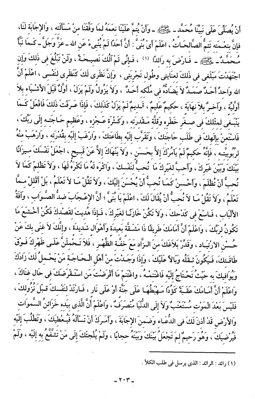 أَنْ يُصَلِّىَ عَلَى نَبِيَّنَا مُحَمَّدٍ - صلى الله عليه وسلم - وَأَنْ يُتِمَّ عَلَيْنَا نِعَمَهُ لِمَا وَفَّقَنَا مِنْ مَسْأَلَتِهِ، وَالإِجَابَةِ لَنَا، فإِنَّ بِنِعْمَتِهِ تَتِمُّ الصَّالِحَاتُ، اعْلَمْ أَىْ بُنَىَّ: أَنَّ أَحَدًا لَمْ يُنْبِئْ عَنِ الله - عَزَّ وَجَلَّ - كَمَا نَبَّأَ مُحَمَّدٌ - صلى الله عليه وسلم - فَارْضَ بِهِ رَائِدًا (¬1)، فَإِنِّى لَمْ آلُكَ نَصِيحَةً، وَلَنْ تَبْلُغَ فِى ذَلِكَ وَإِنِ اجْتَهَدْتَ مَبْلَغِى فِى ذَلكَ لِعِنَايتى وطُولِ تَجْرِبَتِى، وَإِنَّ نَظَرِى لَكَ كَنَظَرِى لِنَفْسِى، اعْلَمْ أَنَّ الله وَاحِدٌ أَحَدٌ صَمَدٌ لَا يَضَادُّهُ فِى مُلْكِهِ أَحَدٌ، وَلاَ يَزُولُ وَلَمْ يَزَلْ، أَوَّلٌ قَبْلَ الأَشْيَاءِ بِلَا أَوَّلِيَّةٍ، وآخِرٌ بِلَا نِهَايَةٍ، حَكِيمٌ عَلِيمٌ، قَدِيمٌ لَمْ يَزَلْ كَذَلِكَ، فَإِذَا عَرَفْتَ ذَلِكَ فَافْعَلْ كَمَا يَنْبَغِى لِمِثْلِكَ فِى صِغَرِ خَطَرِهِ وَقِلَّةِ مَقْدِرَتِهِ، وَكَثْرَةِ عَجْزِهِ، وَعَظِيمِ حَاجَتِهِ إِلَى ربِّكَ، فَاسْتَعِنْ بِإِلَهِكَ فِى طَلَبِ حَاجَتِكَ، وَتَقَرَّب إِلَيْهِ بِطَاعَتِكَ، وَارْغَبْ إِلَيْهِ بِقُدْرَتِهِ، وَارْهَبْ مِنْهُ لِرُبُوبِيَّتِهِ، فَإِنَّهُ حَكِيمٌ لَمْ يَأمُرْكَ إِلَّا بِحَسَنٍ، وَلاَ يَنْهَاكَ إِلَّا عَنْ قَبِيحٍ، اجْعَلْ نَفْسَكَ مِيزَانًا بَيْنَكَ وَبَيْنَ غَيْرِكَ، وَأَحِبَّ لِغَيْرِكَ مَا تُحبُّ لِنَفْسِكَ، وَاكْرَه لَهُ مَا تَكْرَهُ لَهَا، وَلَا تَظْلِمْ كَمَا لَا تُحِبُّ أَنْ تُظْلَمَ، وَأَحْسِنْ كَمَا تُحِبُّ أَنْ يُحْسَنَ إِلَيْكَ، وَلَا تَقُلْ مَا لَا تَعْلَمُ، بَلْ أَقْلِلْ مِمَّا تَعْلَمُ، وَلاَ تَقُلْ مَا لَا تُحِبُّ أَنْ يُقَالَ لَكَ، اعْلَمْ يَا بُنَىَّ؛ أَنَّ الإِعْجَابَ ضِدُّ الصَّوَابِ، وآفَةُ الأَلْبَابِ، فَاسْعَ فِى كَدْحِكَ، وَلَا تَكُنْ خَازَنًا لِغَيْرِكَ، فَإِذَا هُدِيتَ لِقَصْدكَ فَكُنْ أَخْشَعَ مَا تَكُونُ لِرَبِّكَ، وَاعْلَمْ أَنَّ أَمَامَكَ طَرِيقًا ذَا مَشَقَّةٍ بَعيدَةٍ وَأَهْوَالٍ شَدِيدَةٍ، وإِنَّكَ لَا غِنَى بِكَ عَنْ حُسْنِ الارْتِيَادِ، وَقَدِّرْ بَلَاغَكَ مِنَ الزَّادِ مَعَ خفَّةِ الظَّهْرِ، فَلَا تَحْمِلَنَّ عَلَى ظَهْرِكَ فَوْقَ طَاقَتِكَ، فَيَكُونَ ثِقَلُه وَبَالًا عَلَيْكَ، وَإِذَا وَجَدْتَ مِنْ أَهْلِ الْحَاجَةِ مَنْ يَحْمِلُ لَكَ زَادَكَ وَيُوَافِيكَ بِهِ حَيْثُ تَحْتَاجُ إِلَيْه فَاغْتَنِمْهُ، واغْتَنِمْ مَا أَقْرَضْتَ مَن اسْتَقْرَضَكَ فِى حَالِ غِنَاكَ، وَاعْلَمْ أَنَّ أَمَامَكَ عَقَبَةً كَؤُدًا مَهْبَطُهَا عَلَى جَنَّةٍ أَوْ عَلَى نَارٍ، فَارْتَدْ لِنَفْسِكَ قبْلَ نُزُولِكَ، فَلَيْسَ بَعْدَ الْمَوْتِ مُسْتَعْتَبٌ وَلَا إِلَى الدُّنْيَا مُنْصَرَفٌ، وَاعْلَمْ أَنَّ الَّذِى بِيَدِهِ خَزَائِنُ السَّموَاتِ وَالأَرْضِ قَدْ أَذِنَ لَكَ في الدُّعَاءِ وَضَمِنَ الإِجَابَةَ، وَأَمَرَكَ أَنْ تَسْأَلَهُ فَيُعْطِيَكَ، وَتَطْلُبَ إِلَيْهِ فَيُرْضِيَكَ، وَهُوَ رَحِيمٌ لِمَ تَجْعَلُ بَيْنَكَ وَبَيْنَهُ حِجابًا، وَلَمْ يُلْجئْكَ إِلَى مَنْ تَشَّفَّعُ بِهِ إِلَيْه، وَلَمْ