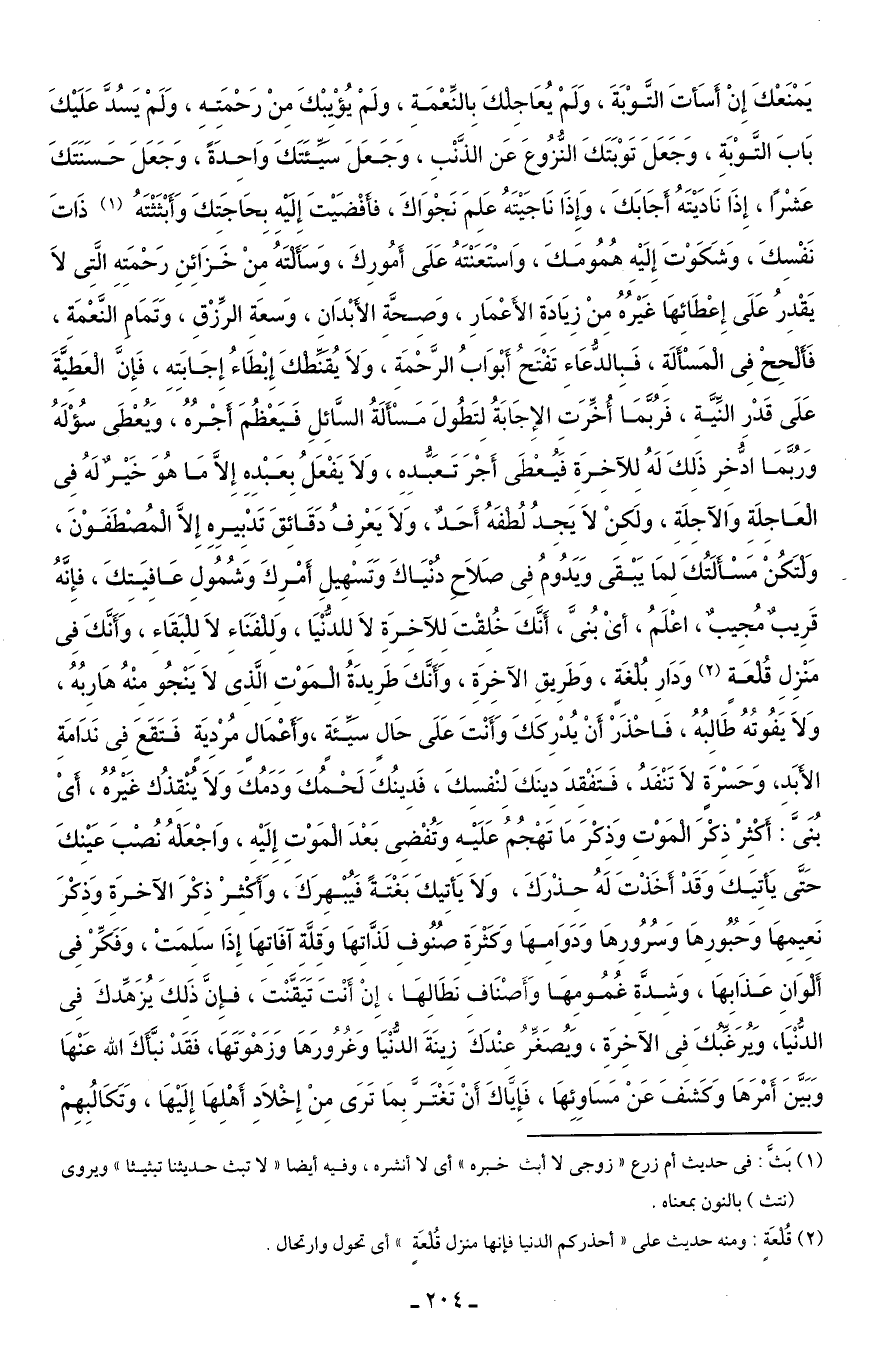 يَمْنَعْكَ إِنْ أَسَأتَ التَّوْبَةَ، وَلَمْ يُعَاجِلْكَ بِالنِّعْمَةِ، ولَمْ يُؤْيِبْكَ مِنْ رَحْمَتِهِ، وَلَمْ يَسُدَّ عَلَيْكَ بَابَ التَّوْبَةِ، وَجَعَلَ تَوْبَتَكَ النُّزُوعَ عَن الذَّنْبِ، وَجَعَلَ سَيَّئَتَكَ وَاحِدَةً، وَجَعَلَ حَسَنَتَكَ عَشْرًا، إِذَا نَادَيْتَهُ أَجَابَكَ، وَإِذَا نَاجَيْتَهُ عَلِمَ نَجْوَاكَ، فأَفْضَيْتَ إِلَيْه بِحَاجَتِكَ وَأَبْثَثْتَهُ (¬1) ذَاتَ نَفْسِكَ، وَشَكَوْتَ إِلَيْهِ هُمُومَكَ، وَاسْتَعَنْتَهُ عَلَى أَمُورِكَ، وَسَأَلْتَهُ مِنْ خَزَائِنِ رَحْمَتِهِ الَّتِى لَا يَقْدرُ عَلَى إِعْطَائِهَا غَيْرُهُ مِنْ زِيَادَةِ الأَعْمَارِ، وَصِحَّةِ الأَبْدَانِ، وَسعَةِ الرِّزْقِ، وَتَمَامِ النَّعْمَةِ، فَأَلْحِحْ فِى الْمَسْأَلَةِ، فَبِالدُّعَاءِ تَفْتَحُ أَبْوَابُ الرَّحْمَةِ، وَلَا يُقنِّطْكَ إِبْطَاءُ إِجَابَتِهِ، فَإِنَّ العَطَيَّةَ عَلَى قَدْرِ النِّيَّةِ، فَرُبَّمَا أُخِّرَتِ الإِجَابَةُ لِتَطُولَ مَسْأَلَةُ السَّائِلِ فَيَعْظُمَ أَجْرُهُ، وَيُعْطَى سُؤْلَهُ وَرُبَّمَا ادُّخِر ذَلِكَ لَهُ لِلآخِرَةِ فَيُعْطَى أَجْرَ تَعَبُّدِهِ، وَلَا يَفْعَلُ بِعَبْدِهِ إِلَّا مَا هُوَ خَيْرٌ لَهُ فِى الْعَاجلَةِ وَالآجِلَةِ، ولَكِنْ لَا يَجِدُ لُطْفَهُ أَحَدٌ، وَلَا يَعْرِفُ دَقَائِقَ تَدْبِيرِهِ إِلَّا المُصْطَفَوْنَ، وَلْتَكُنْ مَسْأَلَتُكَ لِمَا يَبْقَى وَيَدُومُ فِى صَلَاحِ دُنْيَاكَ وَتَسْهِيلِ أَمْرِكَ وَشُمُولِ عَافيَتِكَ، فإِنَّهُ قَرِيبٌ مُجِيبٌ، اعْلَمُ، أىْ بُنىَّ، أَنَّكَ خُلِقْتَ لِلآخِرَةِ لَا لِلدُّنْيَا، وَلِلْفَنَاءِ لَا لِلْبَقَاءِ، وَأَنَّكَ فِى مَنْزِلِ قُلْعَةٍ (¬2) وَدَارِ بُلْغَةٍ، وَطَرِيقِ الآخِرَةِ، وَأَنَّكَ طَرِيدَةُ الْمَوْتِ الَّذِى لَا يَنْجُو مِنْهُ هَارِبُهُ، وَلَا يَفُوتُهُ طَالِبُهُ، فَاحْذَرْ أَنْ يُدْرِكَكَ وَأَنْتَ عَلَى حَالٍ سَيَّئَةٍ، وَأَعْمَالٍ مُرْدِيَةٍ فَتَقَعَ فِى نَدَامَةِ الأَبَدِ، وَحَسْرَةٍ لَا تَنْفَدُ، فَتَفْقِدَ دِينَكَ لِنْفسِكَ، فَدِينُكَ لَحْمُكَ وَدَمُكَ وَلَا يُنْقِذُك غَيْرُهُ، أَىْ بُنَىَّ: أَكْثِرْ ذِكْرَ الْمَوْتِ وَذِكْرَ مَا تَهْجُمُ عَلَيْهِ وَتُفْضِى بَعْدَ المَوْتِ إِلَيْهِ، وَاجْعَلْهُ نُصْبَ عَيْنِكَ حَتَّى يَأتِيَكَ وَقَدْ أَخَذْتَ لَهُ حِذْرَكَ، وَلَا يَأتِيكَ بَغْتةً فَيُبْهِرَكَ، وَأَكْثِرْ ذِكْرَ الآخرَةِ وَذِكْرَ نَعيمِهَا وَحُبُورِهَا وَسُرُورِهَا وَدَوَامِهَا وَكَثْرَةِ صُنُوفِ لَذَّاتِهَا وَقِلَّةِ آفَاتِهَا إِذَا سَلِمَتْ، وَفَكِّرْ فِى أَلْوَانِ عَذَابِهَا، وَشِدَّةِ غُمُومِهَا وَأَصْنَافِ نَطَالِهَا، إِنْ أَنْتَ تَيَقَّنْتَ، فإِنَّ ذَلِكَ يُزَهِّدكَ فِى الدُّنْيَا، وَيُرَغِّبُكَ فِى الآخِرَةِ، وَيُصَغِّرُ عِنْدَكَ زِينَةَ الدُّنْيَا وَغُرُورَهَا وَزَهْوَتَهَا، فَقَدْ نبَّأَكَ الله عَنْهَا وَبَيَّنَ أَمْرَهَا وَكشَفَ عَنْ مَسَاوِئِهَا، فَإِيَّاكَ أَنْ تَغْتَرَّ بِمَا تَرَى مِنْ إِخْلَادِ أَهْلِهَا إِلَيْهَا، وَتَكَالُبِهِمْ