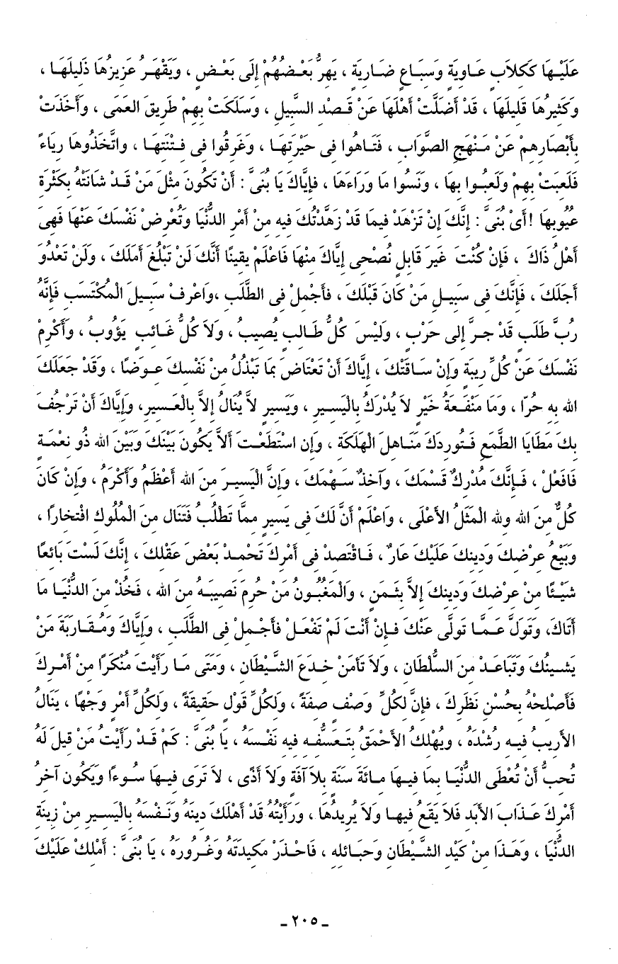 عَلَيْهَا كَكِلَابٍ عَاوِيَةٍ وَسِبَاعٍ ضَارِيَةٍ، يَهِرُّ بَعْضُهُمْ إِلَى بَعْضٍ، وَيَقْهَرُ عَزِيزُهَا ذَلِيلَهَا، وَكَثِيرُهَا قَلِيلَهَا، قَدْ أَضَلَّتْ أَهْلَهَا عَنْ قَصْدِ السَّبِيلِ، وَسَلَكَتْ بِهِمْ طَرِيقَ العَمَى، وَأَخَذَتْ بِأَبْصَارِهِمْ عَنْ مَنْهَجِ الصَّوَابِ، فَتَاهُوا فِى حَيْرَتِهَا، وَغَرِقُوا فِى فِتْنَتِهَا، واتَّخَذُوهَا رِيَاءً فَلَعِبَتْ بِهِمْ وَلَعِبُوا بِهَا، وَنَسُوا مَا وَرَاءَهَا، فإِيَّاكَ يَا بُنَىَّ: أَنْ تَكُونَ مِثْلَ مَنْ قَدْ شَانَتْهُ بِكَثْرَةِ عُيُوبِهَا! أَىْ بُنَىَّ: إِنَّكَ إِنْ تَزْهَدْ فِيمَا قَدْ زَهَّدْتُكَ فِيهِ مِنْ أَمْرِ الدُّنْيَا وَتُعْرِضْ نَفْسَكَ عَنْهَا فَهِىَ أَهْلُ ذَاكَ، فَإنْ كُنْتَ غَيرَ قَابِلٍ نُصْحِى إِيَّاكَ مِنْهَا فَاعْلَمْ يقِينًا أَنَّكَ لَنْ تَبْلُغَ أَمَلَكَ، وَلَنْ تَعْدُوَ أَجَلَكَ، فَإِنَّكَ فِى سَبِيلِ مَنْ كَانَ قَبْلَكَ، فأَجْمِلْ فِى الطَّلَبِ، وَاعْرفْ سَبِيلَ المُكْتَسَبِ فَإِنَّهُ رُبَّ طَلَبٍ قَدْ جرَّ إِلى حَرْبٍ، وَليْسَ كُلُّ طَالِبٍ يُصِيبُ، وَلَا كُلُّ غَائِبٍ يَؤُوبُ، وَأَكْرِمْ نَفْسَكَ عَنْ كُلِّ رِيبَةٍ وَإِنْ سَاقَتْكَ، إِيَّاكَ أَنْ تَعْتَاضَ بمَا تَبْذُلُ مِنْ نَفْسكَ عِوَضًا، وَقَدْ جَعَلَكَ الله بِهِ حُرّا، وَمَا مَنْفَعَةُ خَيْرٍ لَا يُدْرَكُ بالْيَسِيرِ، وَيَسِيرٍ لَا يُنَالُ إِلَّا بِالْعَسِيرِ، وَإيَّاكَ أَنْ تَرْجُفَ بِكَ مَطَايَا الطَّمَعِ فَتُورِدَكَ مَنَاهِلَ الْهَلَكَةِ، وَإِن اسْتَطَعْتَ أَلَّا يَكُونَ بَيْنَكَ وَبَيْنَ الله ذُو نِعْمَةٍ فَافْعَلْ، فَإِنَّكَ مُدْرِكٌ قَسْمَكَ، وآخِذٌ سَهْمَكَ، وَإِنَّ الْيَسِيرَ مِنَ الله أَعْظَمُ وَأَكْرَمُ، وَإِنْ كَانَ كُلٌّ مِنَ الله ولله الْمَثَلُ الأَعْلَى، وَاعْلَمْ أَنَّ لَكَ فِى يَسِيرٍ مِمًّا تَطْلُبُ فَتَنَال مِنَ الْمُلُوكِ افْتِخارًا، وَبَيْعُ عِرْضِكَ وَدِينِكَ عَلَيْكَ عَارٌ، فَاقْتَصِدْ فِى أَمْرِكَ تَحْمِدْ بَعْضَ عَقْلِكَ، إِنَّكَ لَسْتَ بَائِعًا شَيْئًا مِنْ عِرْضِكَ وَدِينِكَ إِلَّا بِثَمَنٍ، وَالْمَغُبُونُ مَنْ حُرِمَ نَصِيبَهُ مِنَ الله، فَخُذْ مِنَ الدُّنْيَا مَا أَتَاكَ، وَتَوَلَّ عَمَّا تَولَّى عَنْكَ فإِنْ أَنْتَ لَمْ تَفْعَلْ فأَجْمِلْ فِى الطَّلَبِ، وَإِيَّاكَ وَمُقَارَبَةَ مَنْ يَشينُكَ وَتَبَاعَدْ مِنَ السُّلْطَانِ، وَلَا تَأمَنْ خِدَعَ الشَّيْطَانِ، وَمَتَى مَا رَأَيْتَ مُنْكَرًا مِنْ أَمْرِكَ فَأَصْلِحْهُ بِحُسْنِ نَظَرِكَ، فإِنَّ لِكُلِّ وَصْفٍ صِفَةً، وَلِكُلِّ قَوْلٍ حَقِيقَةً، وَلِكُلِّ أَمْرٍ وَجْهًا، يَنَالُ الأَرِيبُ فِيهِ رُشْدَهُ، ويُهْلِكُ الأَحْمَقُ بِتَعَسُّفِهِ فِيهِ نَفْسَهُ، يَا بُنَىَّ: كَمْ قَدْ رَأَيْتُ مَنْ قِيلَ لَهُ تُحِبُّ أَنْ تُعْطَى الدُّنْيَا بِمَا فِيهَا مِائَةَ سَنَةٍ بِلَا آفَةٍ وَلَا أَذًى، لَا تَرَى فِيهَا سُوءًا وَيَكُون آخِرُ أَمْرِكَ عَذَابَ الأَبَدِ فَلَا يَقَعُ فِيها وَلَا يُرِيدُهَا، وَرَأَيْتُهُ قَدْ أَهْلَكَ دِينَهُ وَنَفْسَهُ بِالْيَسِيرِ مِنْ زِينَةِ الدُّنْيَا، وَهَذَا مِنْ كَيْدِ الشَّيْطَانِ وَحبَائلِهِ، فَاحْذَرْ مَكِيدَتَهُ وَغُرُورَهُ، يَا بُنَىَّ: أَمْلِكْ عَلَيْكَ