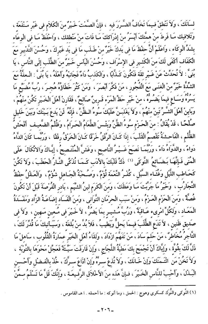 لِسَانَكَ، وَلَا تَنْطِقْ فِيمَا تَخَافُ الضَّرَرَ فِيهِ، فإِنَّ الصَّمْتَ خَيْرٌ مِنَ الْكَلَامِ فِى غَيْرِ مَنْفَعَةٍ، وَتَلافِيك مَا فَرطَ مِنْ هِمَّتِكَ أَيْسَرُ مِنْ إِدْرَاكِكَ مَا فَاتَ مِنْ مَنْطِقِك، وَاحْفَظْ مَا فِى الْوِعَاءِ بِشَدِّ الْوِكَاءِ، وَاعْلَمْ أَنَّ حِفْظَ مَا فِى يَدِكَ خَيْرٌ مِنْ طَلَبِ مَا فِى يَد غَيْرِكَ، وَحُسْنَ التَّدْبِيرِ مَعَ الْكَفَافِ أَكْفَى لَكَ مِنَ الْكَثِيرِ فِى الإِسْرَافِ، وَحُسْنَ الْيَأسِ خَيْرٌ مِنَ الطَّلَبِ إِلَى النَّاسِ، يَا بُنَىَّ: لَا تُحَدِّثْ عَنْ غَيْرِ ثِقَةٍ فَتَكُونَ كَذَّابًا، وَالْكَذِبُ دَاءٌ فَجَانِبْهُ وَأَهْلَهُ، يَا بُنَىَّ: الْعِفَّةُ مَعَ الشِّدَّةِ خَيْرٌ مِنْ الْغِنَى مَعَ الْفُجُورِ، مَنْ فَكَّرَ أَبْصَرَ، وَمَنْ كَثُرَ خَطَاؤُهُ هُجِرَ، رُبَّ مُضَيِّعٍ مَا يَسُرُّهُ وَسَاعٍ فِيمَا يَضُرُّهُ، مِنْ خَيْرِ حَظِّ الْمَرْءِ قَرِينٌ صَالِحٌ، فَقَارِنْ أَهْلَ الْخَيْرِ تَكُنْ مِنْهُمْ، وَبَايِنْ أَهْلَ الشَّرِّ تَبِنْ مِنْهُمْ، وَلَا يَغْلِبَنَّ عَلَيْكَ سُوءُ الظَّنِّ، فَإنَّهُ لَنْ يَدعَ بَيْنَكَ وَبَيْنَ خَلِيلٍ صُلْحًا، قَدْ يُقَالُ: مِنَ الْحَزْمِ سُوءُ الظَّنِّ وَبِئْسَ الطَّعَامُ الْحَرَامُ، وَظُلْمُ الضَّعيفِ أَفْحَشُ الظُّلْمِ، الْفَاحِشَةُ تَقْصِمُ الْقَلْبَ، إِذَا كَانَ الرِّفْقُ خَرْقًا كَانَ الْخَرْقُ رِفْقًا، وَرُبَّما كَانَ الدَّاءُ دَواءً، والدَّوَاءُ دَاءً، وَرُبَّمَا نَصَحَ غَيْرُ النَّاصِحِ، وَغَشَّ الْمُنْتَصِحُ، إِيَّاكَ وَالاتِّكَالَ عَلَى الْمُنَى فَإِنَّهَا بَضَائِعُ النَّوكَى (¬1) ذَكِّ قَلْبَكَ بِالأَدَبِ كَمَا تُذَكِّى النَّارُ الْحَطَبَ، وَلَا تَكُنْ كحَاطِبِ اللَّيْلِ وَغُثَاءِ السَّيْلِ، كُفْرُ النِّعْمَةِ لُؤْمٌ، وَصُحْبَةُ الْجَاهِلِ شُؤْمٌ، وَالْعَقْلُ حِفْظُ التَّجَارُبِ، وَخَيْرُ مَا جَرَّبْتَ مَا وَعَظَكَ، وَمِنَ الْكَرَمِ لِينُ الشِّيَمِ، بَادِرِ الْفُرْصَةَ قَبْلَ أَنْ تَكُونَ غُصَّةً، وَمِنَ الْحَزْم الْعَزْمُ، وَمِنْ سَبَبِ الْحِرْمَانِ التَّوَانِى، وَمِنَ الْفَسَادِ إِضَاعَةُ الزَّادِ وَمَفْسَدَةُ الْمَعَادِ، وَلِكُلِّ امْرِئٍ عَاقِبَةٌ، وَرُبَّ مُشِيرٍ بِمَا يَضُرُّ، لَا خَيْرَ فِى مُعِينٍ مَهِينٍ، وَلَا فِى صَدِيقٍ ظَنِينٍ، لَا تَدَعِ الطَّلَبَ فِيمَا يَحِلُّ وَيَطيبُ، فَلَا بُدَّ مِنْ بُلغَةٍ، وَسَيَأتِيكَ مَا قُدِّرَ لَكَ، التَّاجِرُ مُخَاطِرٌ، مَنْ حَلِمَ سَادَ، مَنْ تَفَهَّمَ ازْدَادَ، وَلِقَاءُ أَهْلِ الْخَيْرِ عِمَارَةُ الْقُلُوبِ، سَاهِلْ مَا ذَلَّ لَكَ بِقُوَّةٍ، وَإِيَّاكَ أَنْ تَجْمَحَ بِكَ مَطِيَّةُ اللَّجَاجِ، وَإِنْ قَارَفْتَ سيِّئَةً فَعَجِّلْ مَحْوَهَا بِالتَّوْبَةِ، وَلَا تَخُنْ مَن ائْتَمَنَكَ وَإنْ خَانَكَ، وَلَا تُذِعْ سِرَّهُ وَإِنْ أذَاعَ سِرَّكَ، خُذْ بِالْفضْلِ وَأَحْسِنِ الْبَذْلَ، وَأَحْبِبْ للِنَّاسِ الْخَيْرَ، فإِنَّ هَذِهِ مِنَ الأَخْلَاقِ الرَّفِيعَةِ، وَإِنَّكَ قَلَّ مَا تَسْلَمُ مِمَّنْ