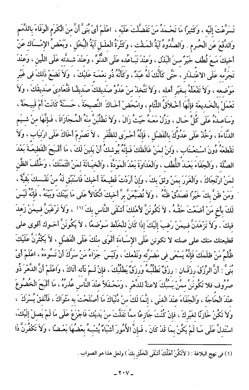 تَسَرَّعْتَ إِلَيْهِ، وَكَثيرًا مَا تَحْمَدُ مَنْ تَفَضَّلْتَ عَلَيْهِ، اعْلَمْ أَىْ بُنَىَّ أَنَّ مِنَ الْكَرَمِ الْوَفَاءَ بِالذِّمَمِ وَالدَّفْعَ عَن الْحُرمِ. وَالصُّدُودُ آيَةُ الْمَقْتِ، وَكَثْرَةُ الْعِلَلِ آيَةُ الْبُخْلِ، وَبَعْضُ الإِمْسَاكِ عَنْ أَخِيكَ مَعَ لُطْفٍ خَيْرٌ مِنَ الْبَذْلِ، وَعِنْدَ تَبَاعُدِهِ عَلَى الدُّنُوِّ، وَعِنْدَ شِدَّتِهِ عَلَى اللِّينِ، وَعِنْدَ تَجَرُّمِهِ عَلَى الاعْتِذَارِ، حَتَّى كَأَنَّكَ لَهُ عَبْدٌ، وَكَأَنَّهُ ذُو نِعْمَةٍ عَليْكَ، وَلَا تَضَعْ ذَلِكَ فِى غَيْرِ مَوْضِعِهِ، وَلَا تَفْعَلْهُ بِغَيْرِ أَهلِهِ، وَلَا تَتَّخِذْ مِنْ عَدُوِّ صَدِيقكَ صَدِيقًا فَتُعَادِىَ صَدِيقَكَ، وَلَا تَعْمَلْ بِالْخَدِيعَةِ فإنَّهَا أَخْلَاقُ اللِّئَامِ، وامْحَضْ أَخَاكَ النَّصِيحَةَ، حَسَنَةً كَانَتْ أَمْ قَبِيحَةً، وَسَاعِدْهُ عَلَى كُلِّ حَالٍ، وَزُلْ مَعَهُ حَيْثُ زَالَ، وَلَا تَطْلُبَنَّ مِنْهُ الْمُجَازَاةَ، فَإِنَّهَا مِنْ شِيَمِ الدَّنَاءَةِ، وَخُذْ عَلَى عَدُوِّكَ بِالْفَضْلِ، فَإِنَّهُ أَحْرَى لِلظَّفَرِ، لَا تَصْرِمْ أَخَاكَ عَلَى ارْتِيَابٍ، وَلَا تَقْطعْهُ دُونَ اسْتِعْتَابٍ، وَلِنْ لِمَنْ غَالَظَكَ فَإِنَّهُ يُوشِكُ أَنْ يَلِينَ لَكَ، مَا أَقْبَحَ الْقَطِيعَةَ بَعْدَ الصِّلَةِ، وَالْجَفَاءَ بَعْدَ اللُّطْفِ، وَالْعَدَاوَةَ بَعْدَ الْمَوَدَّةِ، وَالْخِيَانَةَ لِمَنْ ائْتَمَنَكَ، وَخُلْفَ الظَّنِ لِمَنْ ارْتَجَاكَ، وَالْغَرَرَ بِمَنْ وثِقَ بِكَ، وَإِنْ أَرَدْتَ قَطِيعَةَ أَخِيكَ فَاسْتَبْقِ لَهُ مِنْ نَفْسِكَ بَقِيَّةً، وَمَنْ ظَنَّ بِكَ خَيْرًا فَصَدِّقْ ظَنَّهُ، وَلَا تُضيِّعَنَّ بِرَّ أَخِيكَ اتَّكَالًا عَلى مَا بَيْنَكَ وَبَيْنَهُ، فَإِنَّهُ لَيْسَ لَكَ بِأَخٍ مَنْ أَضَعْتَ حَقَّهُ، لَا تَكُونَنَّ لأَهْلِكَ أَشْقَى النَّاسِ بِكَ (¬1)، وَلَا تَرغَبَنَّ فِيمَنْ زَهِدَ فِيكَ، وَلَا تَزْهَدَنَّ فِيمَنْ رغِبَ إِلَيْكَ إِذَا كَانَ لِلْخَلْطِ مَوْضعًا، لَا يَكُونَنَّ أخوك أقوى على قطيعتك منك على صلته لا تكونن عَلَى الإِسَاءَةِ أَقْوَى مِنْكَ عَلَى الْفَضْلِ، لَا يَكْثُرَنَّ عَلَيْكَ ظُلْمُ مَنْ ظلَمَكَ فَإِنَّهُ يَسْعَى فِى مَضَرَّتِهِ وَنَفْعِكَ، وَلَيْسَ جَزَاءُ مَنْ سَرَّكَ أَنْ تَسُوءَهُ، اعْلَمْ أَىْ بُنَىَّ: أَنَّ الرِّزْقَ رِزْقَانِ: رِزْقٌ تَطْلُبُهُ وَرِزْقٌ يَطْلُبُكَ، فإِنْ لَمْ تَأَتِهِ أَتَاكَ، وَاعْلَمْ أَنَّ الدَّهْرَ ذُو صُرُوفٍ فلا تَكُونَنَّ مِمَّنْ يَسُبُّكَ لاعنةً للدَّهْرِ، وَمَحْفَلًا عِنْدَ النَّاسِ عُذرُهُ، مَا أَقْبَحَ الْخُضُوعَ عِنْدَ الْحَاجَةِ، وَالْجَفَاءَ عِنْدَ الْغِنَى، إِنَّمَا لَكَ مِنْ دُنْيَاكَ مَا أَصْلَحْتَ بِهِ مَثْوَاكَ، فَأَنْفِقْ يُسْرَكَ، وَلَا تَكُنْ خَازنًا لِغَيْرِكَ، فإِنْ كُنْتَ جَازِعًا ممَّا تَفَلَّتَ مِنْ يَديْكَ فَاجْزَعْ عَلَى مَا لَمْ يَصِلْ إِلَيْكَ، اسْتَدِلَّ عَلَى مَا لَمْ يَكُنْ بِمَا قَدْ كَانَ، فَإِنَّ الأُمُورَ أَشْبَاهٌ يُشْبِهُ بِعْضُهَا بَعْضًا، وَلَا تَكْفُرَنَّ ذَا