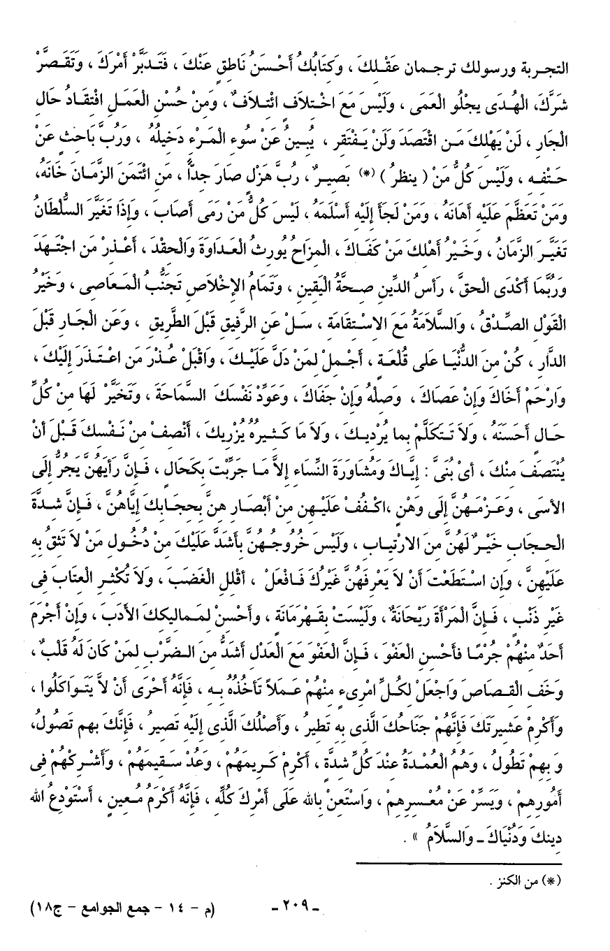 التجربة ورسولك ترجمان عَقْلِكَ، وَكِتَابُكُ أَحْسَنُ نَاطِقٍ عَنْكَ، فَتَدَبَّرْ أَمْرَكَ، وَتَقَصَّرْ شَرَّكَ، الْهُدَى يجْلُو الْعَمَى، وَلَيْسَ مَعَ اخْتِلَافٍ ائْتِلَافٌ، وَمِنْ حُسْنِ الْعَمَلِ افْتِقَادُ حَالِ الْجَارِ، لَنْ يَهْلِكَ مَن اقْتَصَدَ وَلَنْ يَفْتَقِر، يُبِينُ عَنْ سُوءِ الْمَرْءِ دَخِيلُهُ، وَرُبَّ بَاحِثٍ عَنْ حَتْفِهِ، وَلَيْسَ كُلُّ مَنْ (ينظرُ) (*) بَصِيرٌ، رُبَّ هَزْلٍ صَارَ جِدًّا، مَنِ ائْتَمَنَ الزَّمَانَ خَانَهُ، وَمَنْ تَعَظَّمَ عَلَيْهِ أَهَانَهُ، وَمَنْ لَجَأَ إِلَيْهِ أَسْلَمَهُ، لَيْسَ كُلُّ مَنْ رَمَى أَصَابَ، وَإِذَا تَغَيَّرَ السُّلْطَانُ تَغَيَّرَ الزَّمَانُ، وَخَيْرُ أَهْلِكَ مَنْ كفَاكَ، الْمِزَاحُ يُورِثُ الْعَدَاوَةَ وَالْحِقْدَ، أَعْذِرْ مَن اجْتَهَدَ وَرُبَّمَا أَكْدَى الْحقَّ، رَأسُ الدِّينِ صِحَّةُ الْيَقِينِ، وَتَمَامُ الإِخْلَاصِ تَجَنُّبُ الْمَعَاصِى، وَخَيْرُ الْقَوْلِ الصِّدْقُ، وَالسَّلَامَةُ مَعَ الاسْتِقَامَةِ، سَلْ عَنِ الرَّفِيقِ قَبْلَ الطَّرِيقِ، وَعَن الْجَارِ قَبْلَ الدَّارِ، كُنْ مِنَ الدُّنْيَا عَلى قُلْعَةٍ، أَجْمِلْ لِمَنْ دَلَّ عَلَيْكَ، وَاقْبَلْ عُذْرَ مَن اعْتَذَرَ إِلَيْكَ، وَارْحَمْ أَخَاكَ وَإِنْ عَصَاكَ، وَصِلْهُ وَإِنْ جَفَاكَ، وَعَوِّدْ نَفْسَكَ السَّمَاحَةَ، وَتَخَيَّرْ لَهَا مِنْ كُلِّ حَالٍ أَحَسَنَهُ، وَلَا تَتَكَلَّمْ بما يُرْدِيكَ، وَلَا مَا كَثيرُهُ يُزْرِيكَ، أَنْصِفْ مِنْ نَفْسِكَ قَبْلَ أنْ يُنْتَصَفَ مِنْكَ، أىْ بُنَىَّ: إِيَّاكَ وَمُشَاوَرَةَ النِّسَاءِ إِلَّا مَا جَرِّبْتَ بِكَحَالٍ، فَإِنَّ رَأيَهُنَّ يَجُرُّ إِلَى الأسَى، وَعَزْمَهُنَّ إِلَى وَهْنٍ، اكْفُفْ عَلَيْهِن مِنْ أَبْصَارِ هِنَّ بِحِجَابِكَ إِيَّاهُنَّ، فَإِنَّ شِدَّةَ الْحِجَابِ خَيْرٌ لَهُنَّ مِنَ الارْتِيابِ، وَلَيْسَ خُرُوجُهُنَّ بِأَشَدَّ عَلَيْكَ مِنْ دُخُولِ مَنْ لَا تَثِقُ بِهِ عَلَيْهِنَّ، وَإِن اسْتَطَعْتَ أَنْ لَا يَعْرِفَهُنَّ غَيْرُكَ فَافْعَلْ، أقْلِلِ الْغَضَبَ، وَلَا تُكْثِرِ الْعِتَابَ فِى غَيْرِ ذَنْبٍ، فَإِنَّ الْمَرْأَةَ رَيْحَانَةٌ، وَلَيْسَتْ بقَهْرَمَانَةٍ، وأَحْسِنْ لِمَمالِيكِكَ الأَدَبَ، وَإِنْ أَجْرَمَ أَحَدٌ مِنْهُمْ جُرْمًا فأَحْسِنِ الْعَفْوَ، فَإِنَّ الْعَفْوَ مَعَ الْعَدْلِ أَشَدُّ مِنَ الضَّرْبِ لِمَنْ كَانَ لَهُ قَلْبٌ، وَخَفِ الْقِصَاصَ وَاجْعَلْ لِكُلِّ امْرِئٍ مِنْهُمْ عَمَلًا تَأخُذُهُ بِهِ، فَإِنَّهُ أَحْرَى أَنْ لَا يَتَوَاكَلُوا، وَأَكْرِمْ عَشِيرَتَكَ فَإِنَّهُمْ جَنَاحُكَ الَّذِى بِهِ تَطِيرُ، وَأَصْلُكَ الَّذِى إِلَيْهِ تَصِيرُ، فَإِنَّكَ بهم تَصُولُ، وَبِهِمْ تَطُولُ، وَهُمُ الْعُمْدَةُ عِنْدَ كُلِّ شِدَّةٍ، أَكْرِمْ كَرِيمَهُمْ، وَعُدْ سَقِيمَهُمْ، وَأَشْرِكْهُمْ فِى أَمُورِهِمْ، وَيَسِّرْ عَنْ مُعْسِرِهِمْ، وَاسْتَعِنْ بِالله عَلَى أَمْرِكَ كُلِّهِ، فَإِنَّهُ أَكْرَمُ مُعِينٍ، أَسْتَوْدِعُ الله دِينكَ وَدُنْيَاكَ - وَالسَّلَامُ".