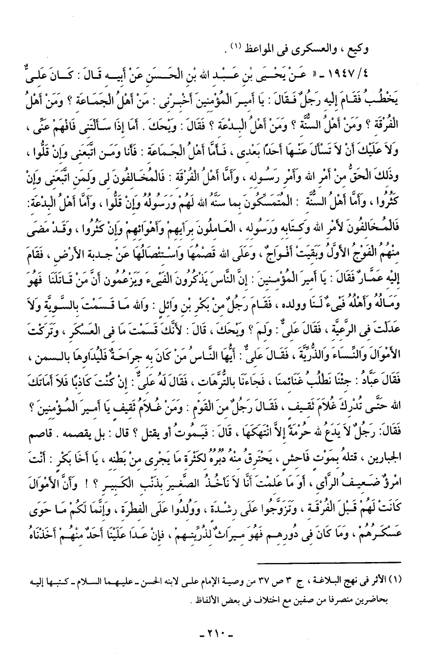 4/ 1947 - "عَنْ يَحْيَى بْنِ عَبْد الله بْنِ الْحَسَنِ عَنْ أَبِيهِ قَالَ: كَانَ عَلِىٌّ يَخْطُبُ فَقَامَ إِلْيهِ رَجُلٌ فَقَالَ: يَا أَمِيرَ الْمُؤمِنِينَ أَخْبِرْنِى: مَنْ أَهْلُ الْجَمَاعَةِ؟ وَمَنْ أَهْلُ الْفُرْقَةِ؟ وَمَنْ أَهْلُ السُّنَّةِ؟ وَمَنْ أَهْلُ الْبِدْعَةِ؟ فَقَالَ: وَيْحَكَ. أَمَا إِذَا سَأَلْتَنِى فَافْهَمْ عَنِّى، وَلَا عَلَيْكَ أَنْ لَا تَسْأَلَ عَنْهَا أَحَدًا بَعْدِى، فَأَمَّا أَهْلُ الْجَمَاعَةِ: فَأَنا وَمَن اتَّبَعَنِى وَإِنْ قَلُّوا، وذَلِكَ الْحَقُّ مِنْ أَمْرِ الله وَأَمْرِ رَسُولِهِ، وَأَمَّا أَهْلُ الْفُرْقَةِ: فَالْمُخَالِفُونَ لِى وَلِمَنِ اتَّبَعَنِى وَإِنْ كَثُرُوا، وَأَمَّا أَهْلُ السُّنَّةِ: الْمُتَمَسِّكُونَ بِما سَنَّهُ الله لَهُمْ وَرَسُولُهُ وَإِنْ قَلُّوا، وَأَمَّا أَهْلُ الْبِدْعَةِ: فَالْمُخَالِفُونَ لأَمْرِ الله وَكِتَابِهِ وَرَسُولِهِ، الْعَامِلُونَ بِرَأيِهِمْ وَأَهْوَائِهِمْ وَإنْ كَثُرُوا، وَقَدْ مَضَى مِنْهُمُ الْفَوْجُ الأَوَّلُ وَبَقِيَتْ أَفْوَاجٌ، وَعَلَى الله قَصْمُهَا وَاسْتِئْصَالُهَا عَنْ جدبة الأَرْضِ، فَقَامَ إِليْهِ عَمَّارٌ فَقَالَ: يَا أَمِيرَ الْمُؤْمِنِينَ: إِنَّ النَّاسَ يَذْكُرُونَ الْفَيْئَ وَيَزْعُمُون أَنَّ مَنْ قَاتَلَنَا فَهُوَ وَمَالُهُ وَأَهْلُهُ فَيْئٌ لَنَا وولده، فَقَامَ رَجُلٌ مِنْ بَكْرِ بْنِ وَائِلٍ: وَالله مَا قَسَمْتَ بالسَّوِيَّةِ وَلَا عَدَلْتَ فِى الرَّعِيَّةِ، فَقَالَ عَلِىٌّ: وَلِمَ؟ وَيْحَكَ، قَالَ: لأَنَّكَ قَسَمْتَ مَا فِى الْعَسْكَرِ، وَتَرَكْتَ الأَمْوَالَ وَالنِّسَاءَ وَالذُّرِّيَّةَ، فَقَالَ عَلِىٌّ: أَيُّهَا النَّاسُ مَنْ كَانَ بِهِ جِرَاحَةٌ فَلْيُدَاوِهَا بالسمن، فَقَالَ عَبَّادُ: جِئْنَا نَطْلُبُ غَنَائِمنَا، فَجَاءَنَا بالتُّرَّهَاتِ، فَقَالَ لَهُ عَلِىٌّ: إِنْ كُنْتَ كَاذِبًا فَلَا أَمَاتَكَ الله حَتَّى تُدْرِكَ غُلَامَ ثَقِيفٍ، فَقَالَ رَجُلٌ مِنَ الْقَومِ: وَمَنْ غُلَامُ ثَقِيفٍ يَا أَمِيرَ الْمُؤْمِنِينَ؟ فَقَالَ: رَجُلٌ لَا يَدعُ لله حُرْمَةً إِلَّا انْتَهَكَهَا، قَالَ: فَيَمُوتُ أو يقتل؟ قال: بل يقصمه. قاصم الجبارين، قتلهُ بِمَوْتٍ فَاحِشٍ، يَحْتَرِقُ مِنْهُ دُبُرُهُ لِكَثْرَةِ مَا يَجْرِى مِنْ بَطْنِهِ، يَا أَخَا بَكْرٍ: أَنْتَ امْرؤٌ ضَعِيفُ الرَّأىِ، أَوَ مَا عَلِمْتَ أَنَّا لَا نَأخُذُ الصَّغِيرَ بِذَنْبِ الْكَبِيرِ؟ ! وَأَنَّ الأَمْوَالَ كَانَتْ لَهُمْ قَبْلَ الْفُرْقَةِ، وَتَزَوَّجُوا عَلَى رِشْدَةٍ، وَوُلِدُوا عَلَى الْفِطْرَةِ، وَإِنَّمَا لَكُمْ مَا حَوَى عَسْكَرُهُمْ، وَمَا كَانَ فِى دُورِهِم فَهُوَ مِيرَاثٌ لِذُرِّيتِهمْ، فإِنْ عَدَا عَلَيْنَا أَحَدٌ مِنْهُمْ أَخَذْنَاهُ