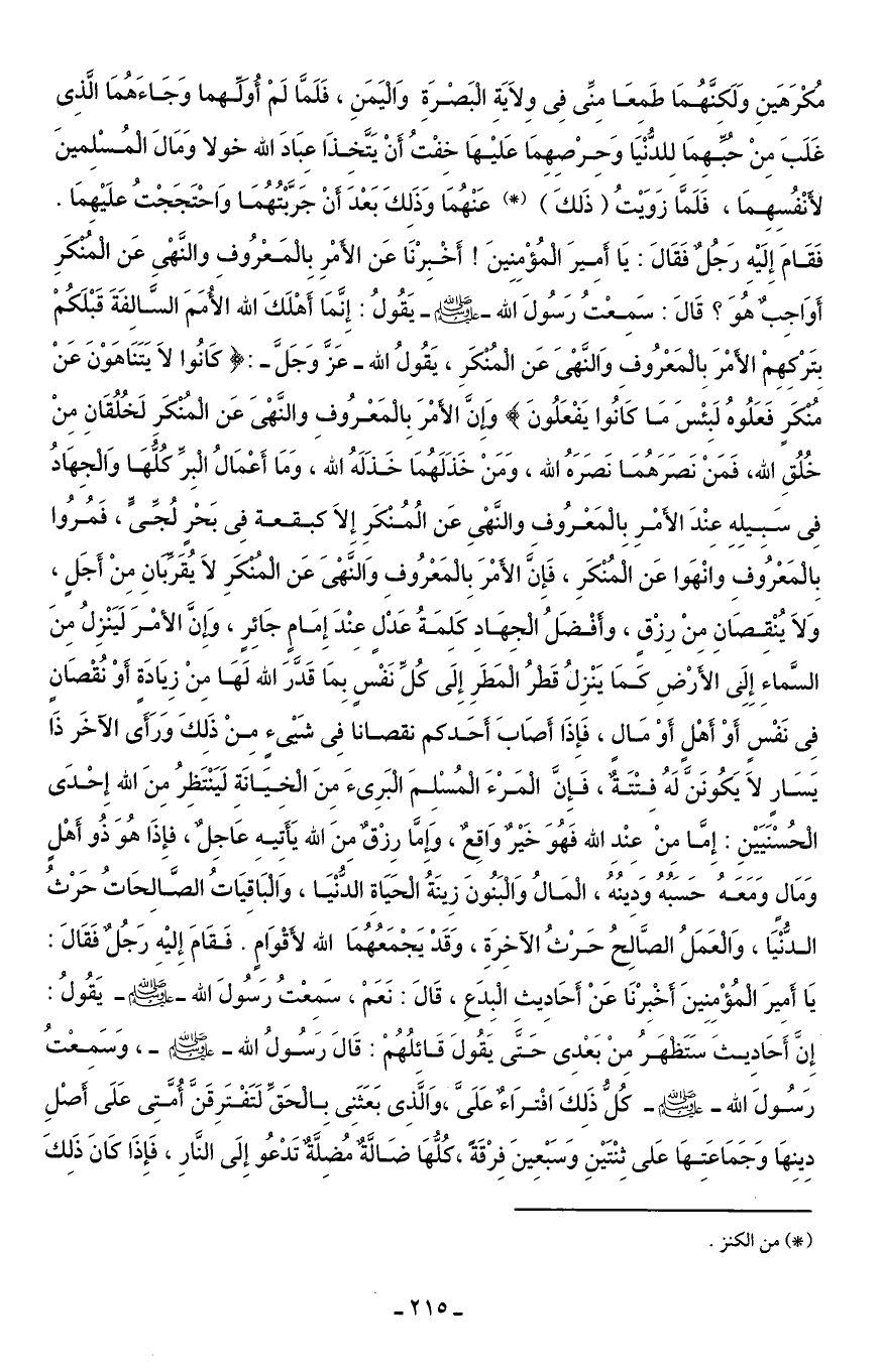 مُكْرَهَينِ وَلَكِنَّهُمَا طَمِعَا مِنِّى فِى وِلَايَةِ الْبَصْرَةِ وَالْيَمَنِ، فَلَمَّا لَمْ أُوَلِّهما وَجَاءَهُمَا الَّذِى غَلَبَ مِنْ حُبِّهِمَا لِلدُّنْيَا وَحِرْصِهِمَا عَليْهَا خِفْتُ أَنْ يَتَّخِذَا عِبَادَ الله خولا وَمَالَ الْمُسْلِمينَ لأَنْفُسِهِمَا، فَلَمَّا زَوَيْتُ (ذَلكَ) (*) عَنْهُمَا وَذَلِكَ بَعْدَ أَنْ جَرَّبْتُهُمَا وَاحْتَجَجْتُ علَيْهِمَا. فَقَامَ إِلَيْهِ رَجُلٌ فَقَالَ: يَا أَمِيرَ الْمُؤْمِنِينَ! أَخْبِرْنَا عَن الأَمْرِ بِالْمَعْرُوفِ والنَّهْىِ عَن الْمَنْكَرِ أَوَاجِبٌ هُوَ؟ قَالَ: سَمِعْتُ رَسُولَ الله - صلى الله عليه وسلم - يَقُولُ: إِنَّمَا أَهْلَكَ الله الأُمَمَ السَّالِفَةَ قَبْلَكُمْ بتَرْكِهِمْ الأَمْرَ بِالْمَعْرُوفِ وَالنَّهْىَ عَن الْمُنْكَرِ، يَقُولُ الله - عَزَّ وَجَلَّ -: {كَانُوا لَا يَتَنَاهَوْنَ عَنْ مُنْكَرٍ فَعَلُوهُ لَبِئْسَ مَا كَانُوا يَفْعَلُونَ} وَإِنَّ الأَمْرَ بِالْمَعْرُوفِ والنَّهْىَ عَن الْمُنْكَرِ لَخُلُقَانِ مِنْ خُلُقِ الله، فَمَنْ نَصَرَهُمَا نَصَرَهُ الله، وَمَنْ خَذَلَهُمَا خَذَلَهُ الله، وَمَا أَعْمَالُ الْبِرِّ كُلُّهَا وَالْجِهَادُ فِى سَبيلِهِ عِنْدَ الأَمْرِ بالْمَعْرُوفِ والنَّهْىِ عَن الُمُنْكَرِ إِلَا كبقعة فِى بَحْرٍ لُجِّىٍّ، فَمُرُوا بِالْمَعْرُوَفِ وانْهَوا عَن الْمُنْكَرِ، فَإِنَّ الأَمْرَ بِالْمَعْرُوفِ وَالنَّهْىَ عَن الْمُنْكَرِ لَا يُقَرِّبَانِ مِنْ أَجَلٍ، وَلَا يُنْقِصَانِ مِنْ رِزْقٍ، وأَفْضَلُ الْجِهَادِ كلِمَةُ عَدْلٍ عِنْدَ إِمَامٍ جَائِرٍ، وَإِنَّ الأمْرَ لَيَنْزِلُ مِنَ السَّماءِ إِلَى الأَرْضِ كَمَا يَنْزِلُ قَطرُ الْمَطَرِ إِلَى كُلِّ نَفْسٍ بِمَا قَدَّرَ الله لَهَا مِنْ زِيَادَةٍ أَوْ نُقْصَانٍ فِى نَفْسٍ أَوْ أَهْلٍ أَوْ مَالٍ، فَإِذَا أَصَابَ أَحَدكم نقصانا فِى شَيْءٍ مِنْ ذَلِكَ وَرَأَى الآخَر ذَا يَسَارٍ لَا يَكُونَنَّ لَهُ فِتْتَةٌ، فَإِنَّ الْمَرْءَ الْمُسْلِمَ الْبرِئَ مِنَ الْخِيَانَةِ لَيَنْتَظِرُ مِنَ الله إِحْدَى الْحُسْنَيَيْنِ: إِمَّا مِنْ عِنْدِ الله فَهُوَ خَيْرٌ وَاقِعٌ، وَإِمَّا رِزْقٌ مِنَ الله يَأَتِيهِ عَاجِلٌ، فإِذَا هُوَ ذُو أَهْلٍ وَمَالٍ وَمَعَهُ حَسَبُهُ وَدِينُهُ، الْمَالُ وَالْبَنُونَ زِينَةُ الْحَيَاةِ الدُّنْيَا، وَالْبَاَقِيَاتُ الصَّالِحَاتُ حَرْثُ الدُّنْيَا، وَالْعَمَلُ الصَّالِحُ حَرْثُ الآخِرَةِ، وَقَدْ يَجْمَعُهُمَا الله لأَقْوَامٍ. فَقَامَ إِليْه رَجُلٌ فَقَالَ: يَا أَمِيرَ الْمُؤْمِنِينَ أَخْبِرْنَا عَنْ أَحَادِيثِ الْبِدَعِ، قَالَ: نَعَمْ، سَمِعْتُ رسُولَ الله - صلى الله عليه وسلم - يَقُولُ: إِنَّ أَحَادِيثَ سَتَظْهَرُ مِنْ بَعْدِى حَتَّى يَقُولَ قَائلُهُمْ: قَالَ رَسُولُ الله - صلى الله عليه وسلم -، وَسَمِعْتُ رَسُولَ الله - صلى الله عليه وسلم - كُلُّ ذَلِكَ افْترَاءٌ عَلَىَّ، وَالًّذِى بَعَثَنِى بِالْحَقِّ لَتَفْتَرِقَنَّ أُمَّتِى عَلَى أَصْلِ دِينِهَا وَجَمَاعَتِهَا عَلى ثِنْتَيْنِ وَسَبْعِينَ فِرْقَةً، كُلُّهَا ضَالَّةٌ مُضِلَّةٌ تَدْعُو إِلَى النَّارِ، فَإِذَا كَانَ ذَلِكَ