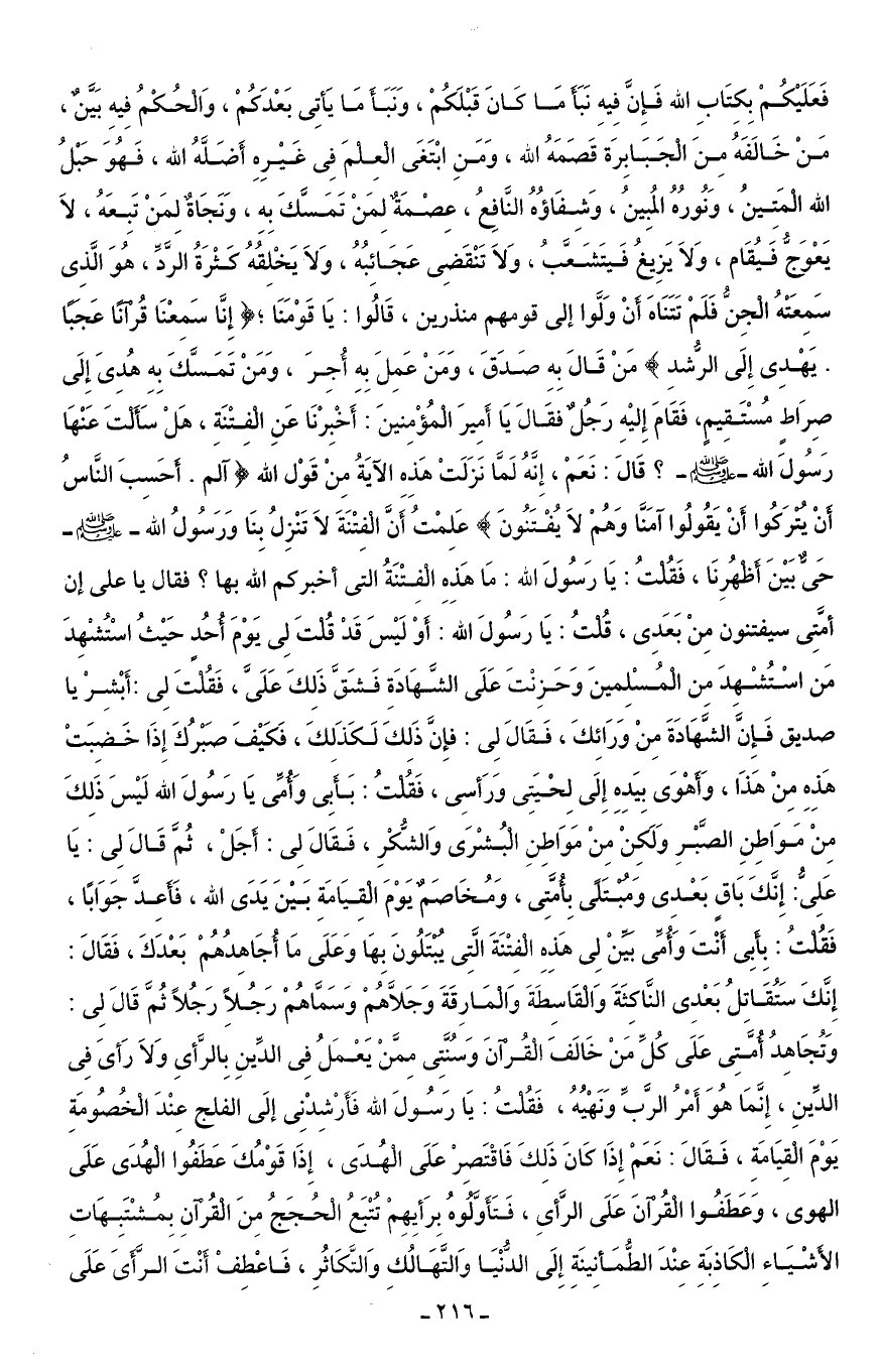 فَعَلَيْكُمْ بِكِتَابِ الله فَإنَّ فِيهِ نَبَأَ مَا كَانَ قَبْلَكُمْ، وَنَبَأَ مَا يَأتِى بَعْدَكُمْ، وَالْحُكْمُ فِيهِ بَيَّنٌ، مَنْ خَالَفَهُ مِنَ الْجَبَابِرَة قَصَمَهُ الله، وَمَنِ ابْتَغَى الْعِلْمَ فِى غَيْرِهِ أَضَلَّهُ الله، فَهُوَ حَبْلُ الله الْمَتِينُ، وَنُورُهُ المُبِينُ، وَشِفَاؤُهُ النَّافِعُ، عِصْمَةٌ لِمَنْ تَمَسَّكَ بِهِ، وَنَجَاةٌ لِمَنْ تَبِعَهُ، لَا يَعْوَجُّ فَيُقَام، وَلَا يَزِيغُ فَيتَشَعَّبُ، وَلَا تَنْقَضِى عَجَائِبُهُ، وَلَا يَخْلِقُهُ كَثْرَةُ الرَّدِّ، هُوَ الَّذِى سَمِعَتْهُ الْجِنُّ فَلَمْ تَتَنَاهَ أَنْ وَلَّوا إلى قومهم منذرين، قَالُوا: يَا قَوْمَنَا؛ {إِنَّا سَمِعْنَا قُرْآنًا عَجَبًا يَهْدِي إِلَى الرُّشْدِ} مَنْ قَالَ بِهِ صَدَقَ، وَمَنْ عَمِلَ بِهِ أُجِرَ، وَمَنْ تَمَسَّكَ بِهِ هُدىَ إِلَى صِرَاطٍ مُسْتَقِيمٍ، فَقَامَ إِليْهِ رَجُلٌ فقَالَ يَا أَمِيرَ الْمُؤْمِنينَ: أَخْبِرْنَا عَنِ الْفِتْنَةِ، هَلْ سَأَلْتَ عَنْهَا رَسُولَ الله - صلى الله عليه وسلم -؟ قَالَ: نَعَمْ، إِنَّهُ لَمَّا نَزَلَتْ هَذِه الآيَةُ مِنْ قَوْل الله {الم (1) أَحَسِبَ النَّاسُ أَنْ يُتْرَكُوا أَنْ يَقُولُوا آمَنَّا وَهُمْ لَا يُفْتَنُونَ} عَلِمْتُ أَنَّ الْفِتْنَةَ لَا تَنْزِلُ بِنَا وَرَسُولُ الله - صلى الله عليه وسلم - حَىٌّ بَيْنَ أَظهُرِنَا، فَقُلْتُ: يَا رَسُولَ الله: مَا هَذِهِ الْفِتْنَةُ التى أخبركم الله بها؟ فقال يا على إن أمَّتِى سيفتنون مِنْ بَعَدِى، قُلْتُ: يَا رَسُولَ الله: أَوْ لَيْسَ قَدْ قُلْتَ لِى يَوْمَ أُحُدٍ حَيْثُ اسْتُشْهِدَ مَن اسْتُشْهِدَ مِن الْمُسْلِمينَ وَحَزِنْتَ عَلَى الشَّهَادَةِ فَشَقَّ ذَلِكَ عَلَىَّ، فَقُلْتَ لِى: أَبْشِرْ يا صديق فَإِنَّ الشَّهَادَةَ مِنْ وَرَائِكَ، فَقَالَ لِى: فإِنَّ ذَلكَ لَكَذَلِكَ، فَكَيْفَ صَبْرُكَ إِذَا خَضِبَتْ هَذِهِ مِنْ هَذَا، وَأَهْوَى بِيَدِهِ إِلَى لِحْيَتِى وَرَأسِى، فَقُلْتُ: بَأَبِى وَأُمِّى يَا رَسُولَ الله لَيْسَ ذَلِكَ مِنْ مَوَاطِنِ الصَّبْرِ وَلَكِنْ مِنْ مَوَاطِنِ الْبُشْرَى وَالشُّكْرِ، فَقَالَ لِى: أَجَلْ، ثُمَّ قَالَ لِى: يَا عَلِىُّ: إِنَّكَ بَاقٍ بَعْدِى وَمُبتَلًى بِأُمَّتِى، وَمُخَاصَمٌ يَوْمَ الْقِيَامَةِ بَيْنَ يَدَى الله، فَأَعِدَّ جَوَابًا، فَقُلْتُ: بِأَبِى أَنْتَ وَأُمِّى بَيِّنْ لِى هَذِهِ الْفِتْنَةَ الَّتِى يُبْتَلُونَ بِهَا وَعَلَى مَا أُجَاهِدُهُمْ بَعْدَكَ، فَقَالَ: إِنَّكَ سَتُقَاتِلُ بَعْدِى النَّاكِثَةَ وَالْقَاسِطَةَ وَالْمَارِقَةَ وَجَلَّاهُمْ وَسَمَّاهُمْ رَجُلًا رَجُلًا ثُمَّ قَالَ لِى: وَتُجَاهِدُ أُمَّتِى عَلَى كُلِّ مَنْ خَالَفَ الْقُرْآنَ وَسُنَّتِى مِمَّنْ يَعْمَلُ فِى الدِّينِ بِالرَّأىِ وَلَا رَأىَ فِى الدِّينِ، إِنَّمَا هُوَ أَمْرُ الرَّبِّ وَنَهْيُهُ، فَقُلْتُ: يَا رَسُولَ الله فَأَرْشِدْنِى إلَى الفلج عِنْدَ الْخُصُومَةِ يَوْمَ الْقِيَامَةِ، فَقَالَ: نَعَمْ إِذَا كَانَ ذَلِكَ فَاقْتَصِرْ عَلَى الْهُدَى، إِذَا قَوْمُكَ عَطَفُوا الْهُدَى عَلَى الهوى، وَعَطَفُوا الْقُرآنَ عَلَى الرَّأىِ، فَتَأَوَّلُوهُ بِرَأيِهِمْ تُتْبَعُ الْحُجَجُ مِنَ الْقُرْآنِ بِمُشْتَبِهَاتِ الأَشْيَاءِ الْكَاذِبَةِ عِنْدَ الطُّمَأنِينَةِ إِلَى الدُّنْيَا وَالتَّهَالُكِ وَالتَّكَاثُرِ، فَاعْطِفْ أَنْتَ الرَّأَىَ عَلَى