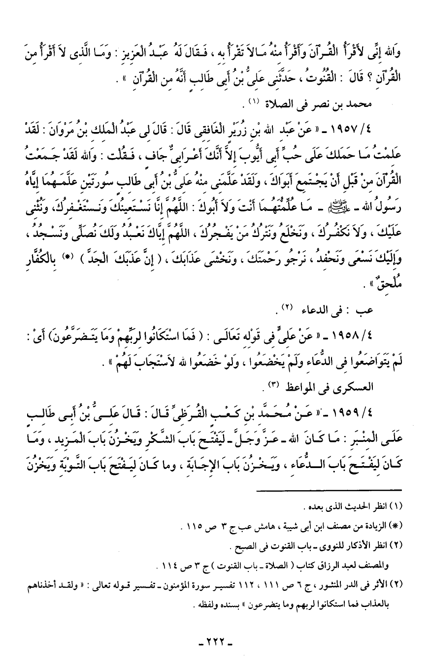 4/ 1957 - "عَنْ عَبْد الله بْنِ زُرَيْرٍ الْغَافِقِى قَالَ: قَالَ لِى عَبْدُ الْمَلِكِ بْنُ مَرْوَانَ: لَقَدْ عَلِمْتُ مَا حَمَلكَ عَلَى حُبِّ أَبِى أَيُّوبَ إِلَّا أَنَّكَ أَعْرَابِىٌّ جَافٍ، فَقُلْت: وَالله لَقَدْ جَمَعْتُ الْقُرْآنَ مِنْ قَبْلِ أَنْ يَجْتَمِعَ أَبَوَاكَ، وَلَقَدْ عَلَّمَنِى مِنْهُ عَلِىُّ بْنُ أَبِى طَالِبٍ سُورَتَيْنِ عَلَّمَهُمَا إِيَّاهُ رَسُولُ الله - صلى الله عليه وسلم - مَا عُلِّمْتَهُمَا أَنْتَ وَلَا أَبُوكَ: اللَّهُمَّ إِنَّا نَسْتَعِينُكَ وَنسْتَغْفِرُكَ، وَنُثْنِى عَلَيْكَ، وَلَا نَكْفُرُكَ، وَنَخْلَعُ وَنَتْرُكُ مَنْ يَفْجُرُكَ، اللَّهُمَّ إِيَّاكَ نَعْبُدُ وَلَكَ نُصَلِّى وَنَسْجُدُ، وَإِلَيْكَ نَسْعَى وَنَحْفِدُ، نَرْجُو رَحْمَتَكَ، وَنَخْشَى عَذَابَكَ، (إِنَّ عَذَبَكَ الْجَدَّ) (*) بِالْكُفَّارِ مُلْحِقٌ".