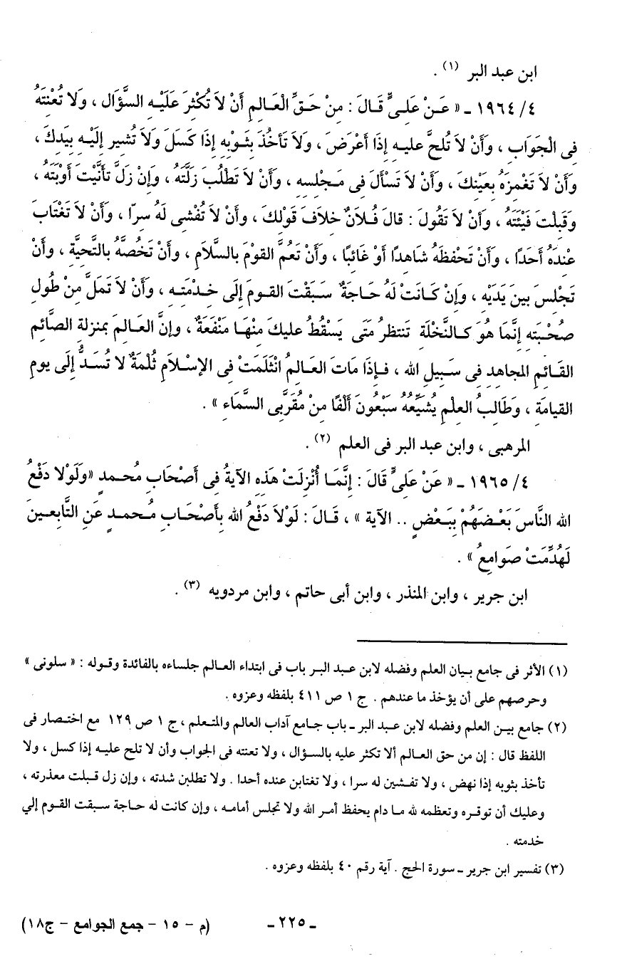 4/ 1964 - "عَنْ عَلِىٍّ قَالَ: مِنْ حَقِّ الْعَالِمِ أَنْ لَا تُكْثِرَ عَلَيْهِ السَّؤَال، وَلا تُعْنِتَهُ فِى الْجَوَابِ، وَأَنْ لَا تُلحَّ عليهِ إِذَا أَعْرَضَ، وَلَا تَأخُذَ بِثَوْبِهِ إِذَا كَسَلَ وَلَا تُشِير إِلَيْهِ بِيَدِكَ، وَأَنْ لَا تَغْمِزَهُ بِعَيْنِكَ، وَأَنْ لَا تَسْأَلَ فِى مَجْلِسِهِ، وَأَنْ لَا تَطْلُبَ زَلَّتَهُ، وَإِنْ زَلَّ تأَنَّيْتَ أَوْبَتَهُ، وَقَبِلْتَ فَيْئَتَهُ، وَأنْ لَا تَقُولَ: قالَ فُلَانٌ خِلَافَ قَوْلِكَ، وأَنْ لَا تُفْشِى لَهُ سِرّا، وَأَنْ لَا تَغْتَابَ عْنِدَهُ أَحَدًا، وَأَنْ تَحْفظَهُ شَاهِدًا أَوْ غَائِبًا، وَأَنْ تَعُمَّ القوْمَ بالسَّلَامِ، وأَنْ تَخُصَّهُ بالتَّحِيَّةِ، وأَنْ تَجْلِسَ بينَ يَدَيْهِ، وَإِنْ كَانَتْ لَهُ حَاجَةٌ سَبَقْتَ القومَ إِلَى خِدْمَتِهِ، وَأَنْ لَا تَمَلَّ مِنْ طُولِ صُحْبَتهِ إِنَّمَا هُوَ كالنَّخْلَةِ تَنتظرُ مَتَى يَسْقُطُ عليكَ مِنْهَا مَنْفَعَةٌ، وإنَّ العَالِمَ بمنزلة الصَّائِم القَائِمِ المجاهِدِ فِى سَبِيلِ الله، فإِذَا مَاتَ العَالِمُ انْثَلَمَتْ فِى الإسْلَامِ ثُلْمَةٌ لا تُسَدُّ إِلَى يومِ القيامَةِ، وَطَالِبُ العِلْمِ يُشَيِّعُهُ سَبْعُونَ أَلْفًا مِنْ مُقَرَّبِى السَّمَاءِ".