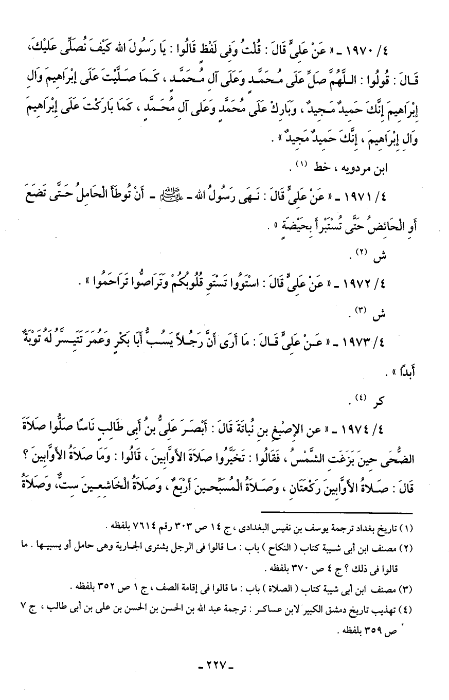 4/ 1970 - "عَنْ عَلِىٍّ قَالَ: قُلْتُ وَفِى لَفْظٍ قَالُوا: يَا رَسُولَ الله كَيْفَ نُصَلِّى عَليْكَ، قَالَ: قُولُوا: اللَّهُمَّ صَلِّ عَلَى مُحَمَّدٍ وَعَلَى آلِ مُحَمَّدٍ، كمَا صَلَّيْتَ عَلَى إبْرَاهِيمَ وَآلِ إِبْرَاهِيمَ إِنَّكَ حَمِيدٌ مَجِيدٌ، وَبَارِكْ عَلَى مُحَمَّدٍ وَعَلى آلِ مُحَمَّدٍ، كَمَا بَارَكْتَ عَلَى إِبْرَاهِيمَ وَآلِ إِبْرَاهِيمَ، إِنَّكَ حَمِيدٌ مَجِيدٌ".