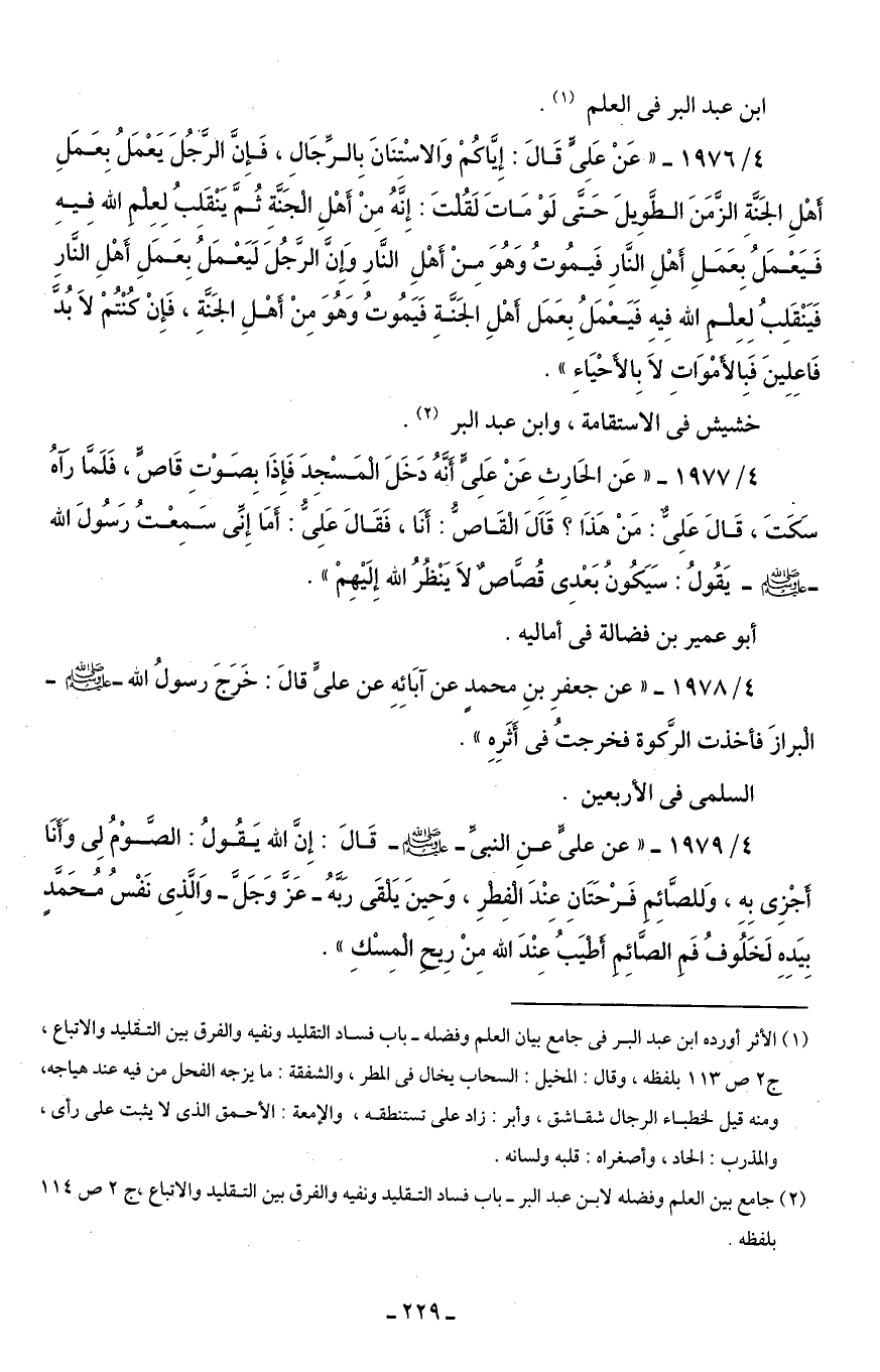 (¬2) جامع بين العلم وفضله لابن عبد البر - باب فساد التقليد ونفيه والفرق بين التقليد والاتباع، ج 2 ص 114 بلفظه.