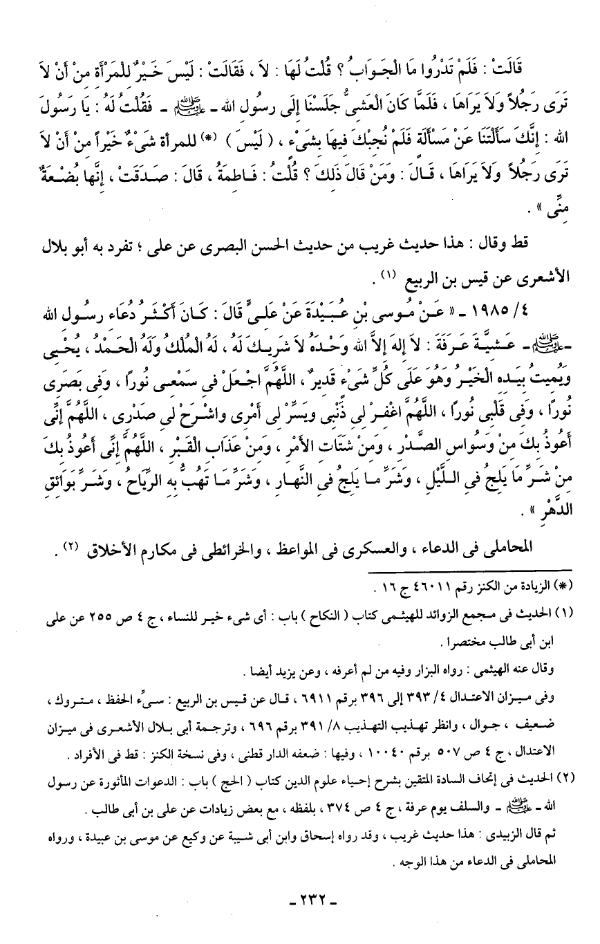 4/ 1985 - "عَنْ مُوسى بْنِ عُبَيْدَةَ عَنْ عَلِىٍّ قَالَ: كَانَ أَكْثَرُ دعُاءِ رسُولِ الله - صلى الله عليه وسلم - عَشِيَّةَ عَرَفَةَ: لَا إِلهَ إِلَّا الله وَحْدَهُ لَا شَرِيكَ لَهُ، لَهُ الْمُلْكُ وَلَهُ الْحَمْدُ، يُحْيِي وَيُمِيتُ بِيَدِهِ الْخَيْرُ وَهُوَ عَلَى كُلِّ شَىْءٍ قَدِيرٌ، اللَّهُمَّ اجْعَلْ فِي سَمْعِى نُورًا، وَفِى بَصَرِى نُورًا، وَفِى قَلْبِى نُورًا، اللَّهُمَّ اغْفِرْ لِىِ ذَنْبِى ويَسِّرْ لِى أَمْرِى واشْرَحْ لىِ صَدْرِى، اللَّهُمَّ إنَّى أَعُوذُ بِكَ مِنْ وَسُواسِ الصَّدْرِ، وَمِنْ شَتَاتِ الأَمْرِ، وَمِنْ عَذَابِ الْقَبْرِ، اللَّهُمَّ إِنِّى أَعُوذُ بِكَ مِنْ شَرِّ مَا يَلِجُ في اللَّيْلِ، وَشَرَ ما يَلِجُ في النَّهارِ، وَشَرِّ مَا تَهُبُّ بِهِ الرِّيَاحُ، وَشَرِّ بَوَائِقِ الدَّهْرِ".