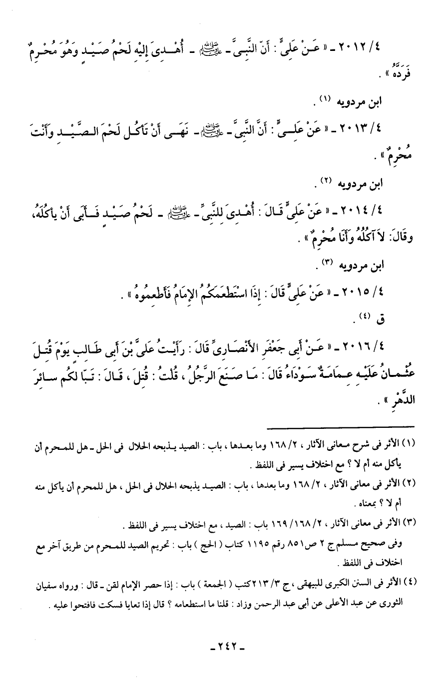 (¬2) الأثر في معاني الآثار، 2/ 168 وما بعدها، باب: الصيد يذبحه الحلال في الحل، هل للمحرم أن يأكل منه أم لا؟ بمعناه.