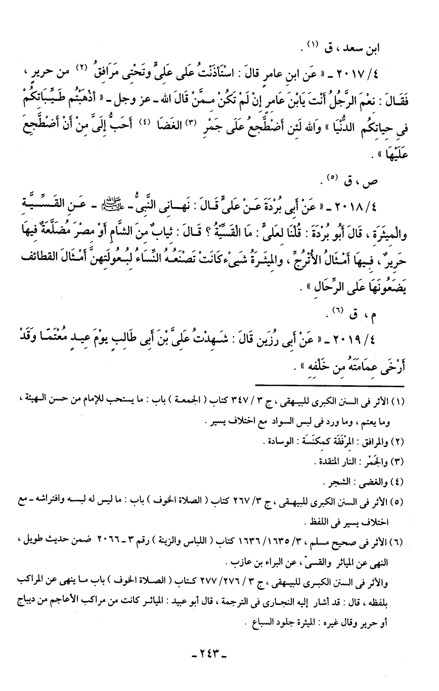 (¬6) الأثر في صحيح مسلم، 3/ 1635/ 1636 كتاب (اللباس والزينة) رقم 3 - 2066 ضمن حديث طويل، النهي عن المياثر والقسىّ، عن البراء بن عازب.
