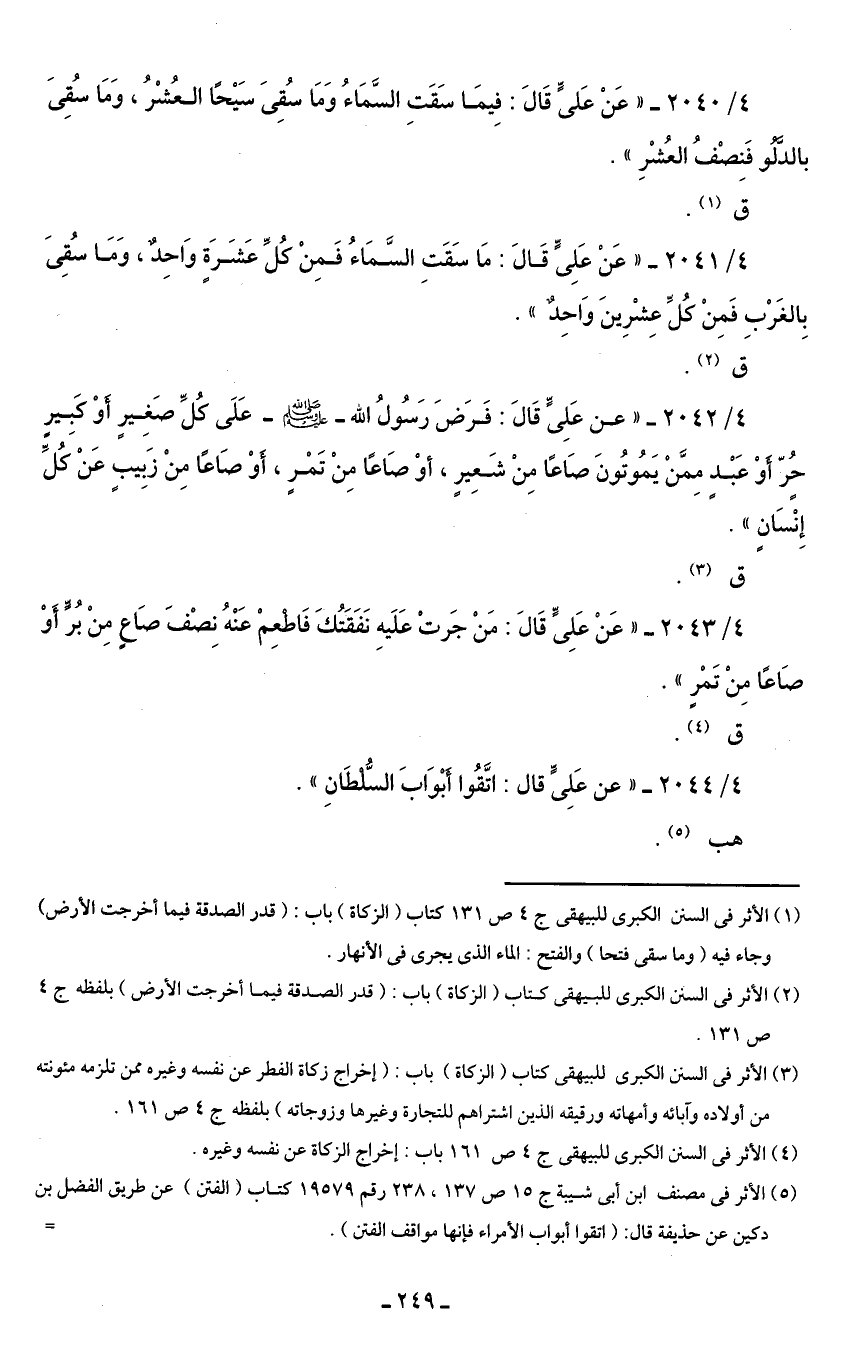 4/ 2041 - "عَنْ عَلِىٍّ قَالَ: مَا سَقَتِ السَّمَاءُ فَمِنْ كُلِّ عَشَرَةٍ وَاحِدٌ، وَمَا سُقِىَ بِالغَرْبِ فَمِنْ كُلِّ عِشْرِينَ وَاحِدٌ".