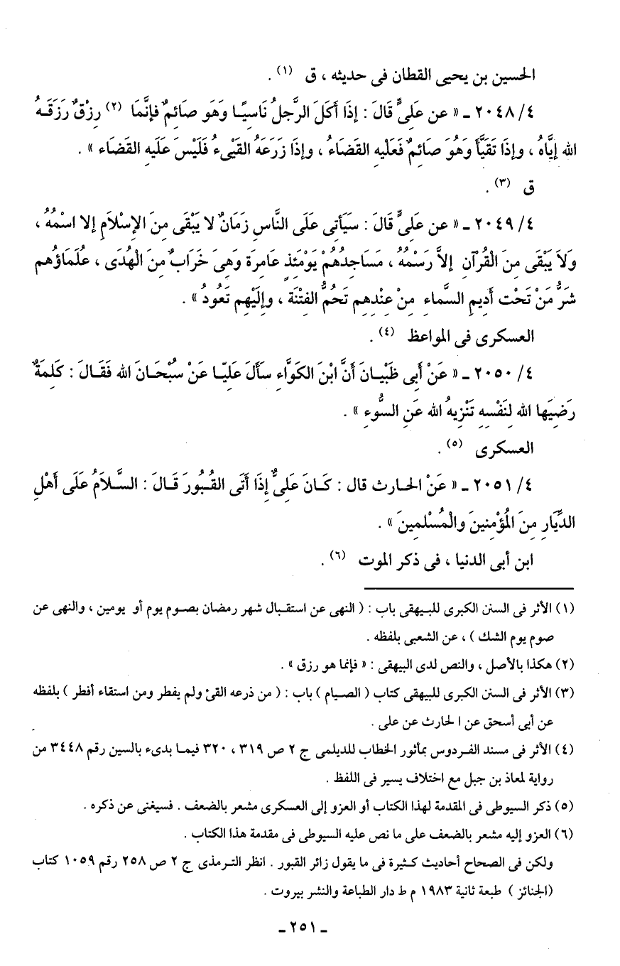 4/ 2049 - "عن عَلِىٍّ قَالَ: سَيَأتِى عَلَى النَّاسِ زَمَانٌ لا يَبْقَى مِنَ الإسْلَامِ إلا اسْمُهُ، وَلَا يَبْقَى مِنَ الْقُرْآنِ إِلَّا رَسْمُهُ، مَسَاجِدُهُمْ يَوْمَئِذٍ عَامِرَة وَهِىَ خَرَابٌ مِنَ الْهُدَى، عُلَمَاؤُهم شَرُّ مَنْ تَحْت أَدِيمِ السَّماءِ مِنْ عِنْدِهِم تَحُمُّ الفِتْنَة، وإِلَيْهِم تَعُودُ".