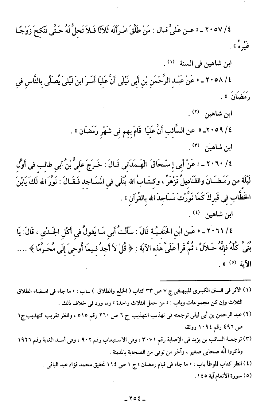 4/ 2059 - "عن السَّائِبِ أَنَّ عَلِيّا قَامَ بِهِم فِى شَهْرِ رَمَضَان".