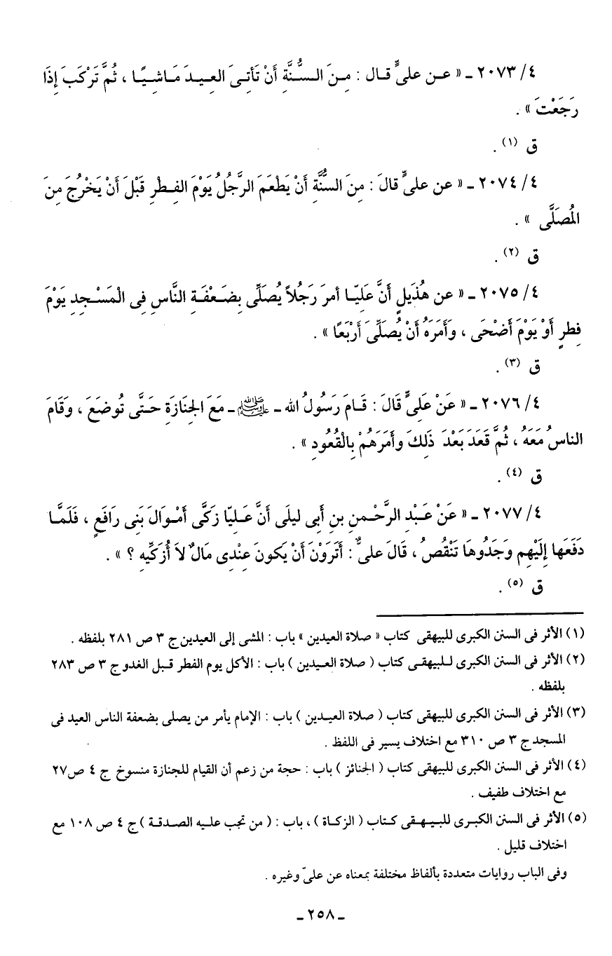 4/ 2073 - "عن علىٍّ قال: مِنَ السُّنَّةِ أَنْ تَأتِىَ العِيدَ مَاشِيًا، ثُمَّ تَرْكَبَ إِذَا رَجَعْتَ"