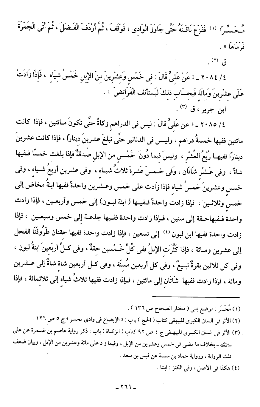 4/ 2084 - "عَنْ عَلِىٍّ قَالَ: فِى خَمْسٍ وَعِشْرِينَ مِنَ الإِبِلِ خَمْسُ شِيَاهٍ، فَإِذَا زَادَتْ عَلَى عِشْرِينَ وَمِائَةٍ فَبحِسَابِ ذلِكَ ليَستأنف الْفَرَائِضَ".