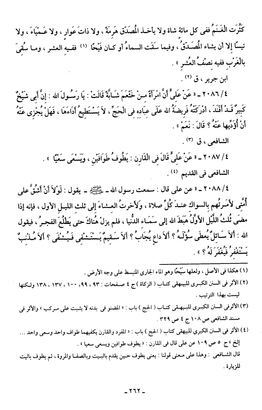(¬4) الأثر في السنن الكبرى للبيهقى كتاب (الحج) باب: "المفرد والقارن يكفيهما طواف واحد وسعى واحد ... إلخ، ج 5 ص 109 عن على قال في القارن: "يطوف طوافين ويسعى سعيا".