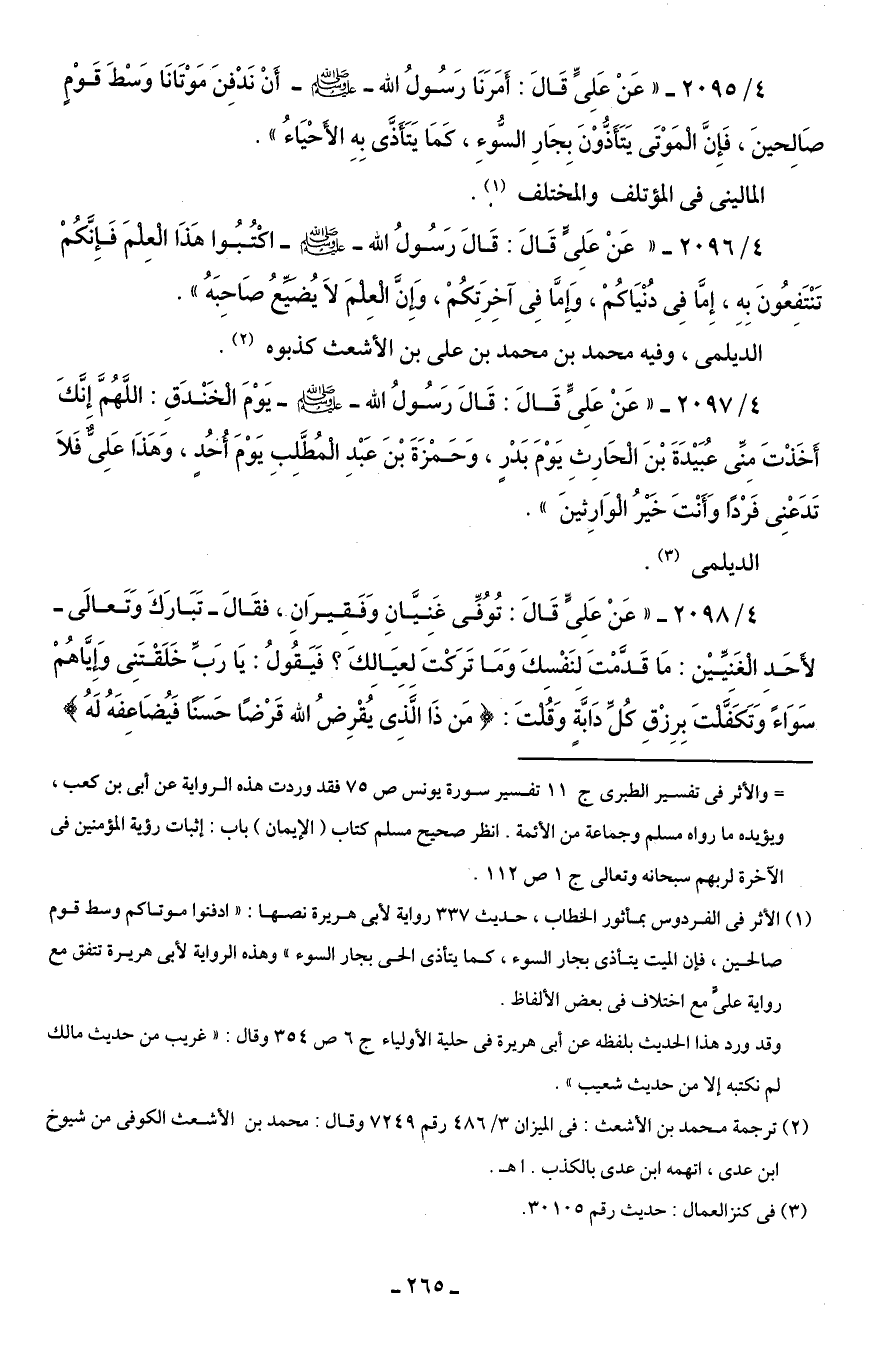 (¬1) الأثر في الفردوس بمأثور الخطاب، حديث 337 رواية لأبى هريرة نصها: "ادفنوا موتاكم وسط قوم صالحين، فإن الميت يتأذى بجار السوء، كما يتأذى الحى بجار السوء" وهذه الرواية لأبى هريرة تتفق مع رواية علىًّ مع اختلاف في بعض الألفاظ.