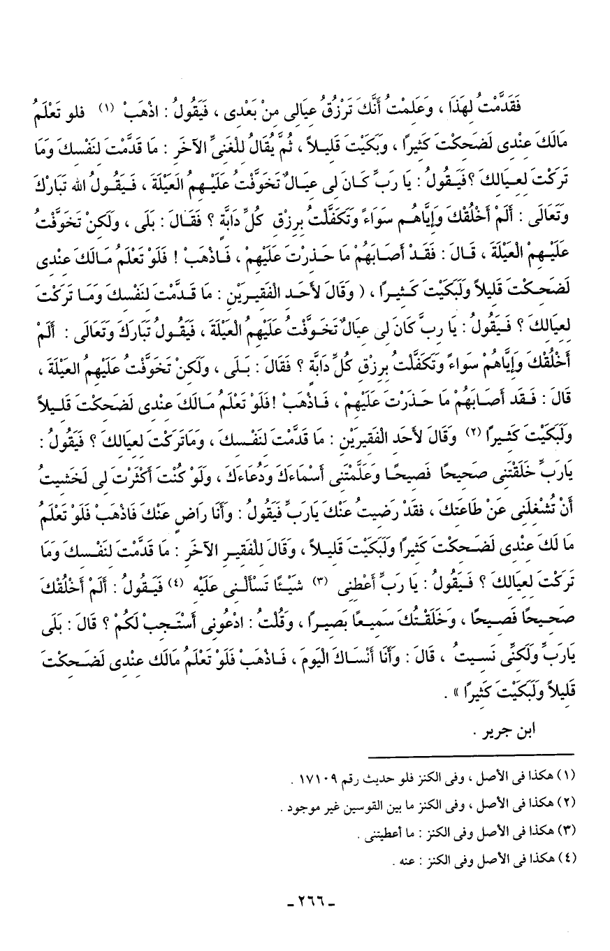 فَقَدَّمْتُ لِهَذَا، وَعَلِمْتُ أَنَّكَ تَرْزُقُ عيَالِى مِنْ بَعْدِى، فَيَقُولُ: اذْهَبْ (¬1) فلو تَعْلَمُ مَالَكَ عِنْدِى لَضَحِكْتَ كثِيرًا، وَبَكَيْتَ قَلِيلًا، ثُمَّ يُقَالُ لِلْغَنِيِّ الآخَرِ: مَا قَدَّمْتَ لِنَفْسِكَ وَمَا تَرَكْتَ لِعِيَالِكَ؟ فَيَقُولُ: يَا رَبِّ كَانَ لِى عيَالٌ تَخَوَّفْتُ عَلَيْهِمُ العَيْلَةَ، فَيَقُولُ الله تَبَارْكَ وَتَعَالَى: أَلَمْ أَخْلُقْكَ وَإِيَّاهُم سَوَاءً وَتَكَفَّلْتُ بِرِزْقِ كُلِّ دَابَّةٍ؟ فَقَالَ: بَلَى، وَلَكِنْ تَخَوَّفْتُ عَلَيْهِمْ الْعَيْلَةَ، قَالَ: فَقَدْ أَصَابَهُمْ مَا حَذِرْتَ عَلَيْهِمْ، فَاذْهَبْ! فَلَوْ تَعْلَمُ مَالَكَ عِنْدِى لَضَحِكْتَ قَلِيلًا وَلَبَكَيْتَ كثِيرًا، (وَقَالَ لأَحَدِ الْفَقِيرَيْنِ: مَا قَدَّمْتَ لِنَفْسِكَ وَمَا تَرَكْتَ لِعِيَالِكَ؟ فَيَقُولُ: يَا رَبَّ كَانَ لِى عِيَالٌ تَخَوَّفْتُ عَلَيْهِمُ الْعَيْلَةَ، فَيَقُولُ تَبَارَكَ وَتَعَالَى: أَلَمْ أَخْلُقْكَ وَإِيَّاهُمْ سَواءً وَتَكَفَّلْتُ بِرِزْقِ كُلِّ دَابَّةٍ؟ فَقَالَ: بَلَى، وَلَكِنْ تَخَوَّفْتُ عَلَيْهِمُ العَيْلَةَ، قَالَ: فَقَد أَصَابَهُمْ مَا حَذَرْتَ عَلَيْهِمْ، فَاذْهَبْ! فَلَوْ تَعْلَمُ مَالَكَ عِنْدِى لَضَحِكْتَ قَلِيلًا وَلَبَكَيْتَ كَثِيرًا (¬2) وَقَالَ لأَحَد الْفَقِيرَيْنِ: مَا قَدَّمْتَ لِنَفْسِكَ، وَمَا تَرَكْتَ لِعِيَالِكَ؟ فَيَقُولُ: يَا رَبِّ خَلَقْتَنِى صَحِيحًا فَصِيحًا وَعَلَّمْتَنِى أسْمَاءَكَ وَدُعَاءَكَ، وَلَوْ كُنْتَ أكْثَرْتَ لِى لَخَشِيتُ أَنْ تُشْغِلَنِى عَنْ طَاعَتِكَ، فقَدْ رَضِيتُ عَنْكَ يَا رَبِّ فَيَقُولُ: وَأَنَا رَاضٍ عَنْكَ فَاذْهَبْ فَلَوْ تَعْلَمُ مَا لَكَ عِنْدِى لَضَحِكْتَ كثِيرًا وَلَبَكَيْتَ قَلِيلًا، وَقَالَ لِلْفَقِيرِ الآخَرِ: مَا قَدَّمْتَ لِنَفْسِكَ وَمَا تَرَكْتَ لِعِيَالِكَ؟ فَيَقُولُ: يَا رَبِّ أَعْطِنِى (¬3) شَيْئًا تَسْأَلْنِى عَلَيْهِ (¬4) فَيَقُولُ: أَلَمْ أَخْلُقْكَ صَحِيحًا فَصِيحًا، وَخَلَقْتُكَ سَمِيعًا بَصِيرًا، وَقُلْتُ: ادْعُونِى أَسْتَجِبْ لَكُمْ؟ قَالَ: بَلَى يَا رَبِّ وَلَكِنِّى نَسِيتُ، قَالَ: وَأنَا أَنْسَاكَ الْيَومَ، فَاذْهَبْ فَلَوْ تَعْلَمُ مَالَك عِنْدِى لَضَحِكْتَ قَلِيلًا وَلَبَكَيْتَ كَثِيرًا".