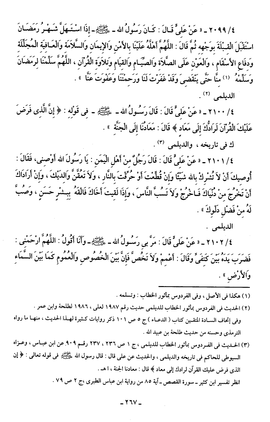 (¬3) الحديث في الفردوس بمأثور الخطاب للديلمى، ج 1 ص 236، 237 رقم 909 عن ابن عباس، وعزاه السيوطى للحاكم في تاريخه والديلمى، والحديث عن على قال: قال رسول الله - صلى الله عليه وسلم - في قوله تعالى: {إِنَّ الَّذِي فَرَضَ عَلَيْكَ الْقُرْآنَ لَرَادُّكَ إِلَى مَعَادٍ} قال: معادنا الجنة، اهـ.