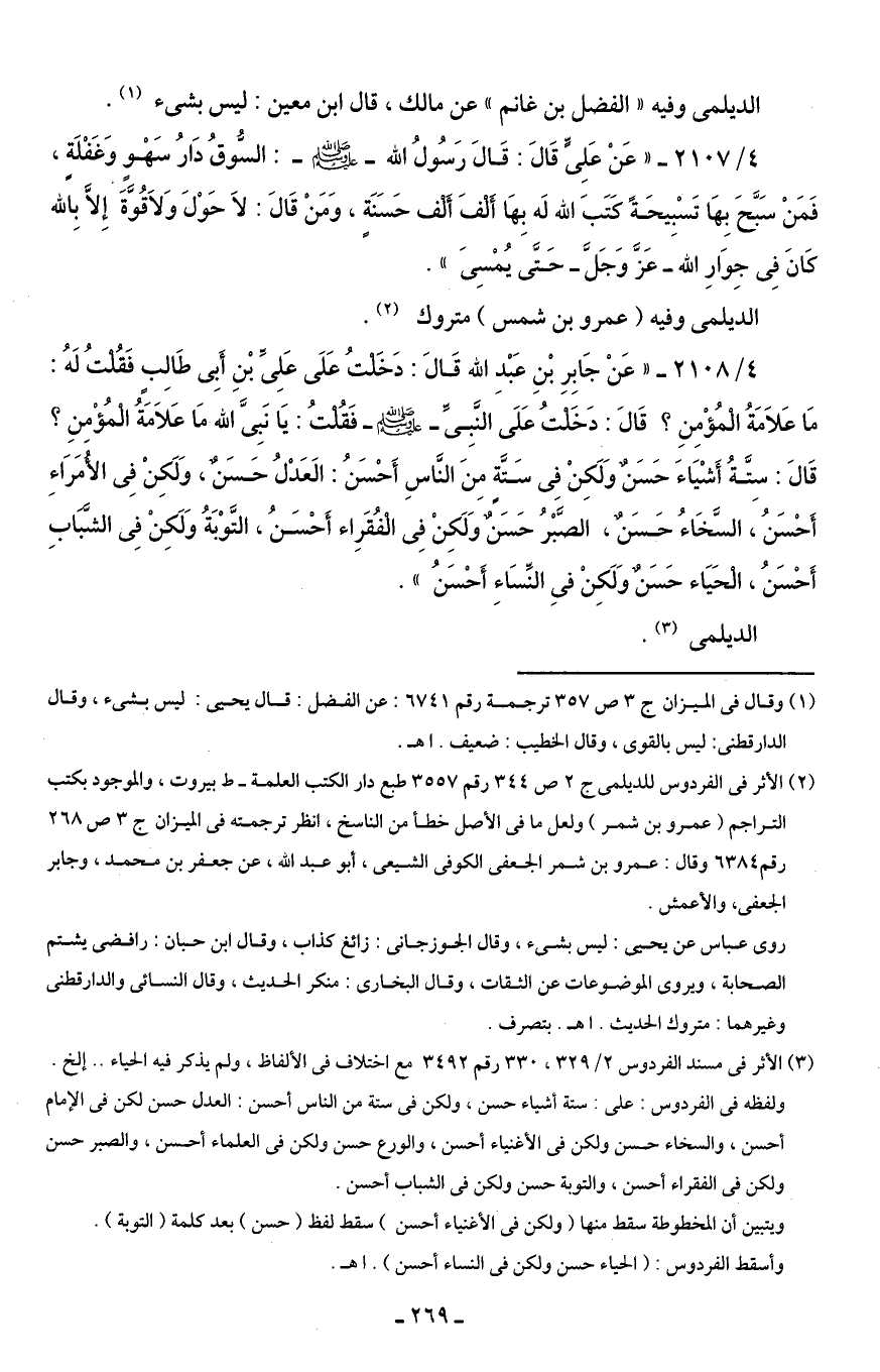 4/ 2108 - "عَنْ جَابِرِ بْنِ عَبْدِ الله قَالَ: دَخَلْتُ عَلَى عَلِيِّ بْنِ أَبِى طَالِبٍ فَقُلْتُ لَهُ: مَا عَلَامَةُ الْمُؤْمِنِ؟ قَالَ: دَخَلْتُ عَلَى النَّبِىَّ - صلى الله عليه وسلم - فَقُلْتُ: يَا نَبِىَّ الله مَا عَلَامَةُ الْمُؤْمِنِ؟ قَالَ: سِتَّةُ أَشْيَاءَ حَسَنٌ وَلَكِنْ فِي سَتَّةٍ مِنَ النَّاسِ أَحْسَنُ: الَعَدْلُ حَسَنٌ، وَلَكِنْ في الأُمَرَاءِ أَحْسَنُ، السَّخَاءُ حَسَنٌ، الصَّبْرُ حَسَنٌ وَلَكِنْ في الْفُقَرَاء أَحْسَنُ، التَّوْبَةُ وَلَكِنْ فِي الشَّبَابِ أَحْسَنُ، الْحَيَاء حَسَنٌ وَلَكِنْ فِي النِّسَاءِ أَحْسَنُ".