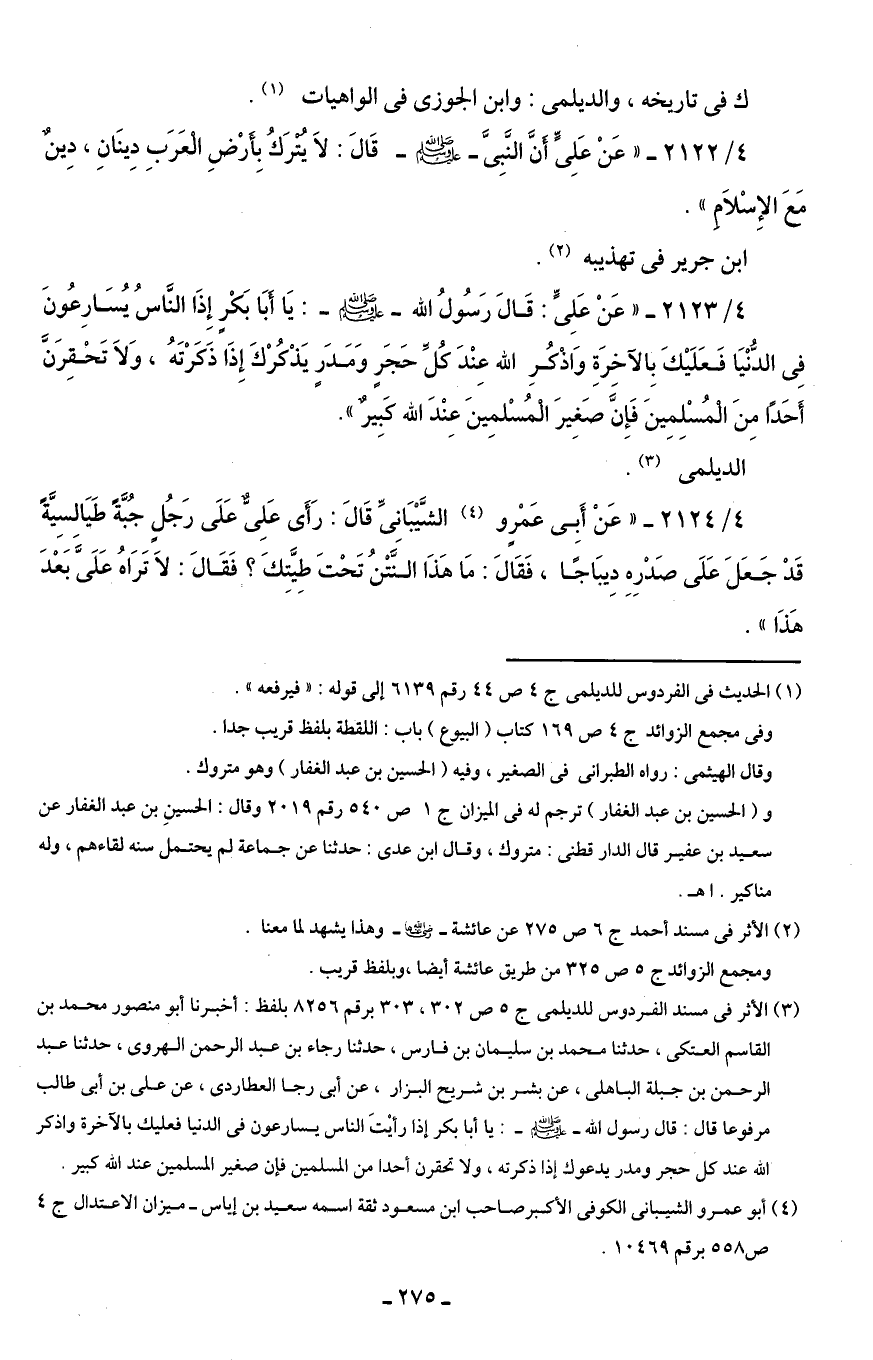 4/ 2122 - "عَنْ عَلِىٍّ أَنَّ النَّبِىَّ - صلى الله عليه وسلم - قَالَ: لَا يُتْرَكُ بِأَرْضِ الْعَرَبِ دِينَانِ، دِينٌ مَعَ الإِسْلَامِ".