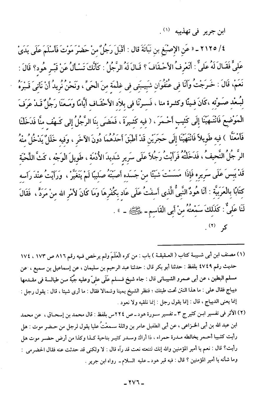 (¬2) الأثر في تفسير ابن كثير ج 3 - تفسير سورة هود - ص 224 س بلفظ: قال محمد بن إسحاق، عن محمد بن عبد الله بن أبى الخزاعى، عن أبى الطفيل عامر بن واثلة سمعْتُ عليا يقول لرجل من حضر موت: هل رأيت كثيبا أحمر يخالطه مدرة حمراء، ذا أراك وسدر كثير بناحية كذا وكذا من أرض حضر موت هل رأيت؟ قال: نعم يا أمير المؤمنين والله إنك لتنعته نعت قد رآه قال: لا ولكنى قد حدثت عنه فقال الحضرمى: وما شأنه يا أمير المؤمنين؟ قال: فيه قبر هود - عليه السلام - رواه ابن جرير.