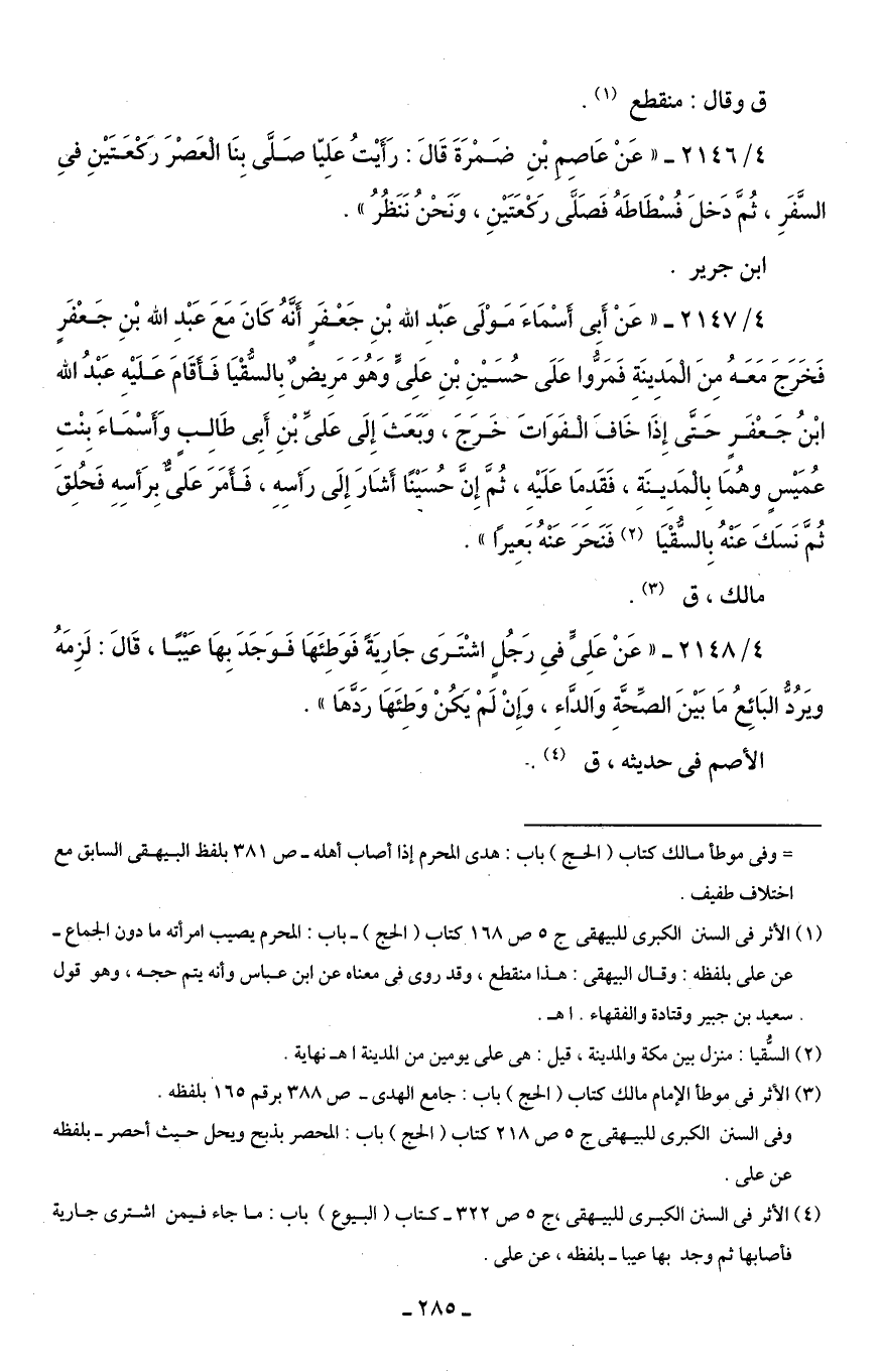 4/ 2146 - "عَنْ عَاصِمِ بْنِ ضَمْرَةَ قَالَ: رَأَيْتُ عَلِيّا صَلَّى بِنَا الْعَصْرَ رَكْعَتَيْنِ فِي السَّفَرِ، ثُمَّ دَخلَ فُسْطَاطَهُ فَصَلَّى رَكْعَتَيْنِ، وَنَحْنُ نَنَظُرُ".
